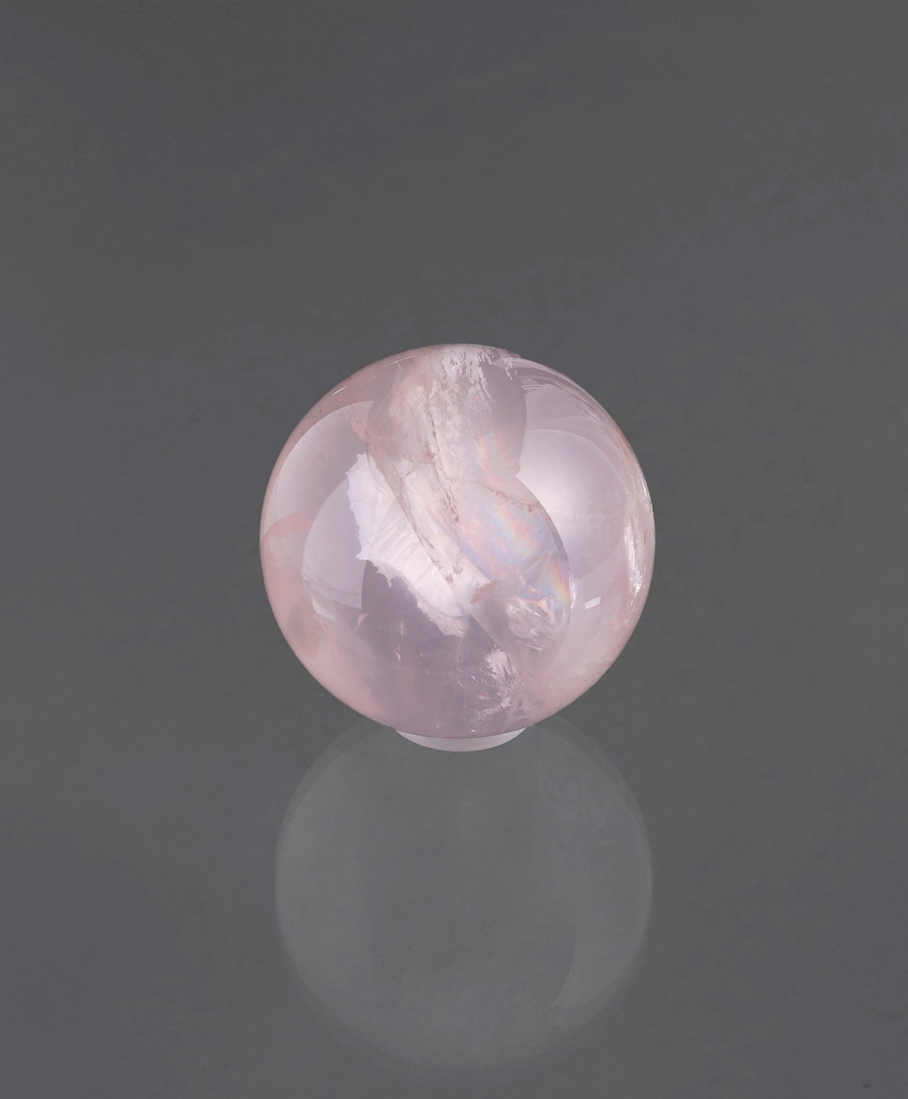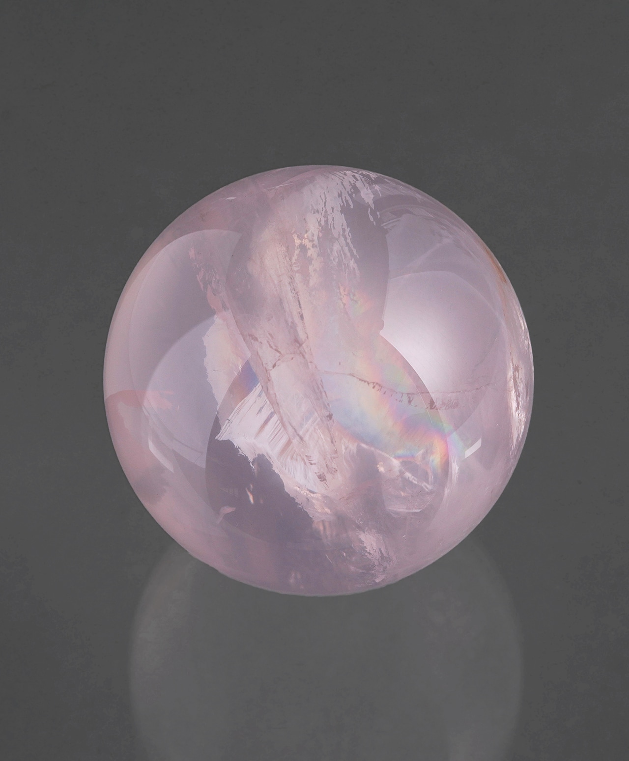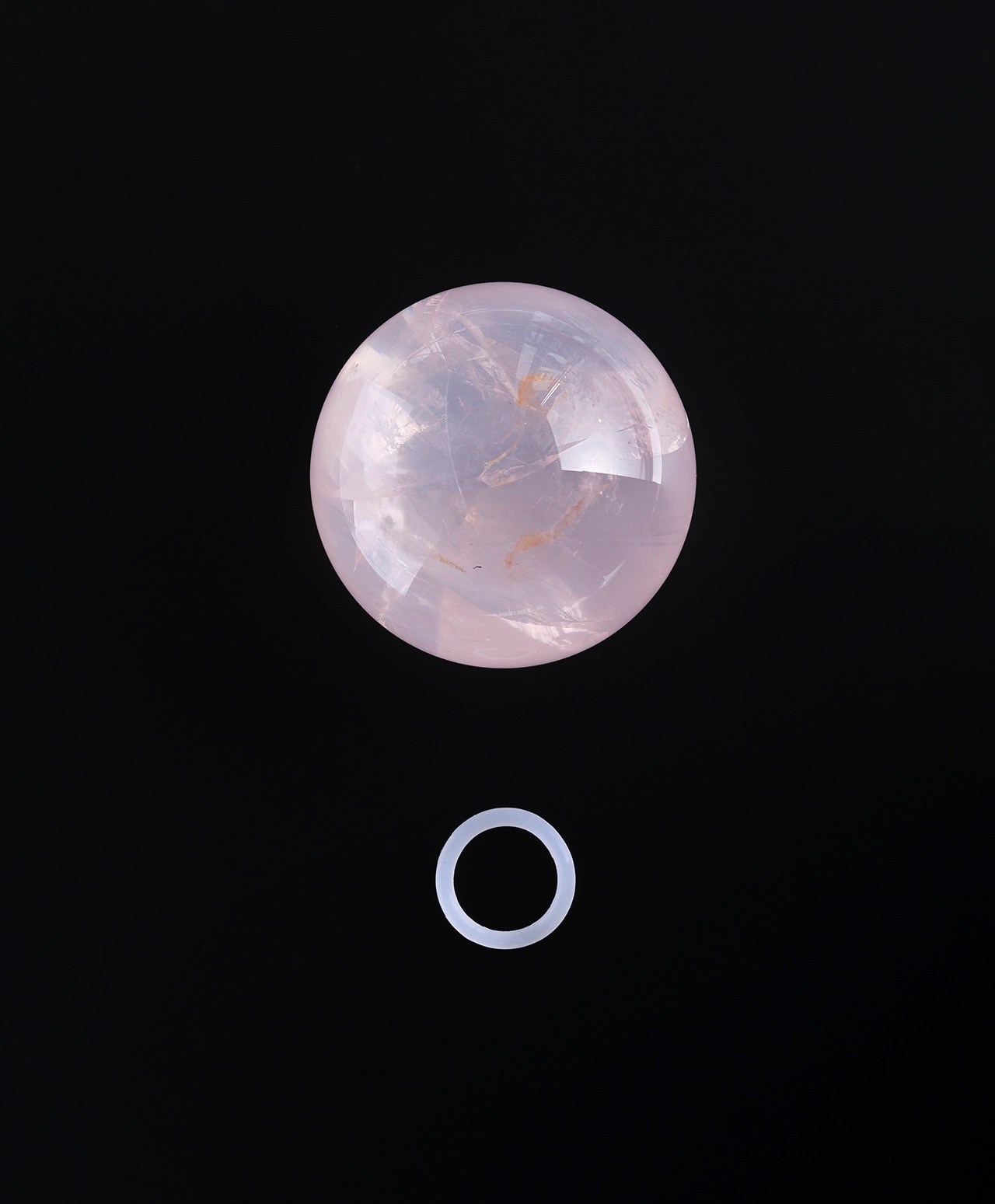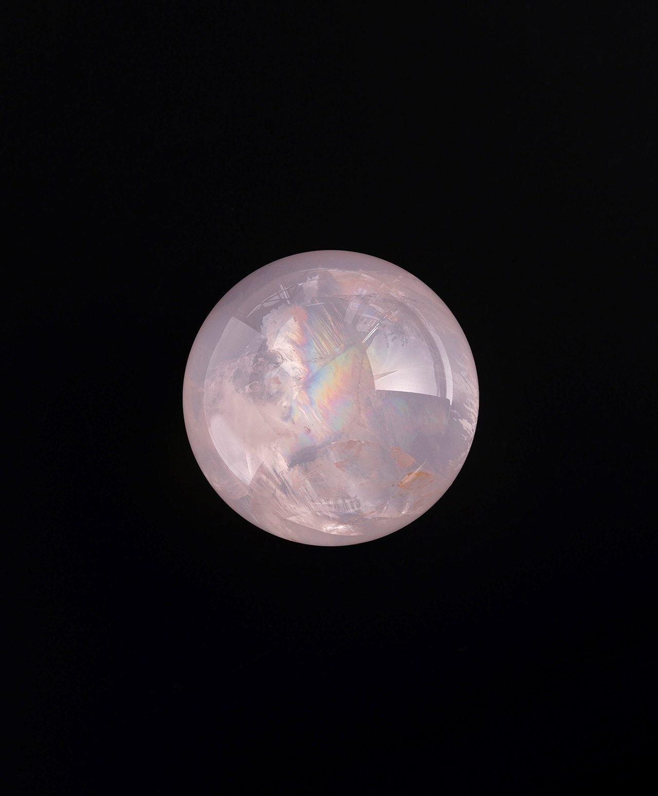 満月のように丸く磨かれた、淡いピンク色のアイリスローズクォーツ(ブラジル産)。