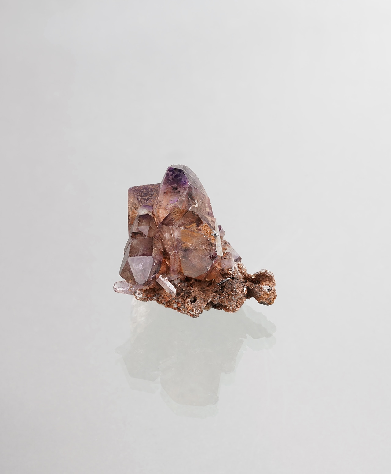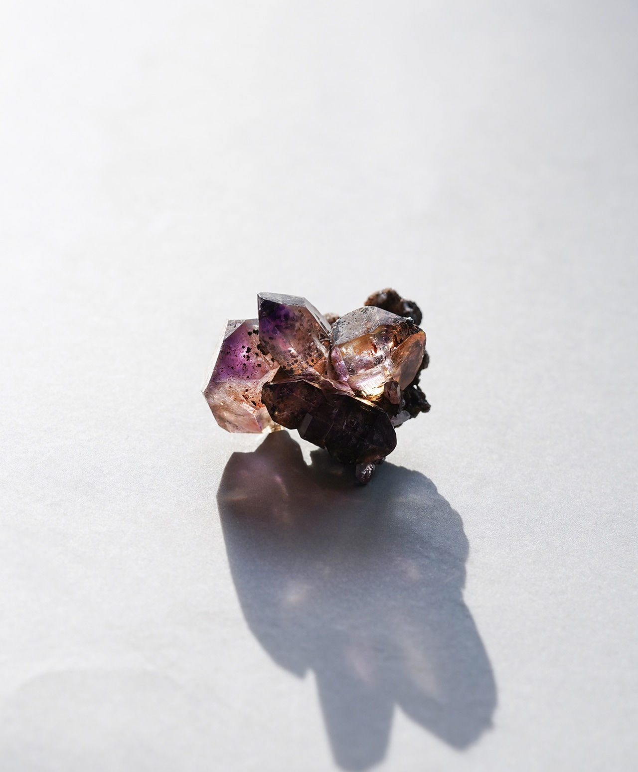 パープル、レッド、グレー、褐色などの豊かな内包物が、宇宙銀河を漂うスターダストのように混在するスーパーセブン。黒い母岩の上に咲く水晶の花のような佇まいは、まさに自然の神秘そのもの。