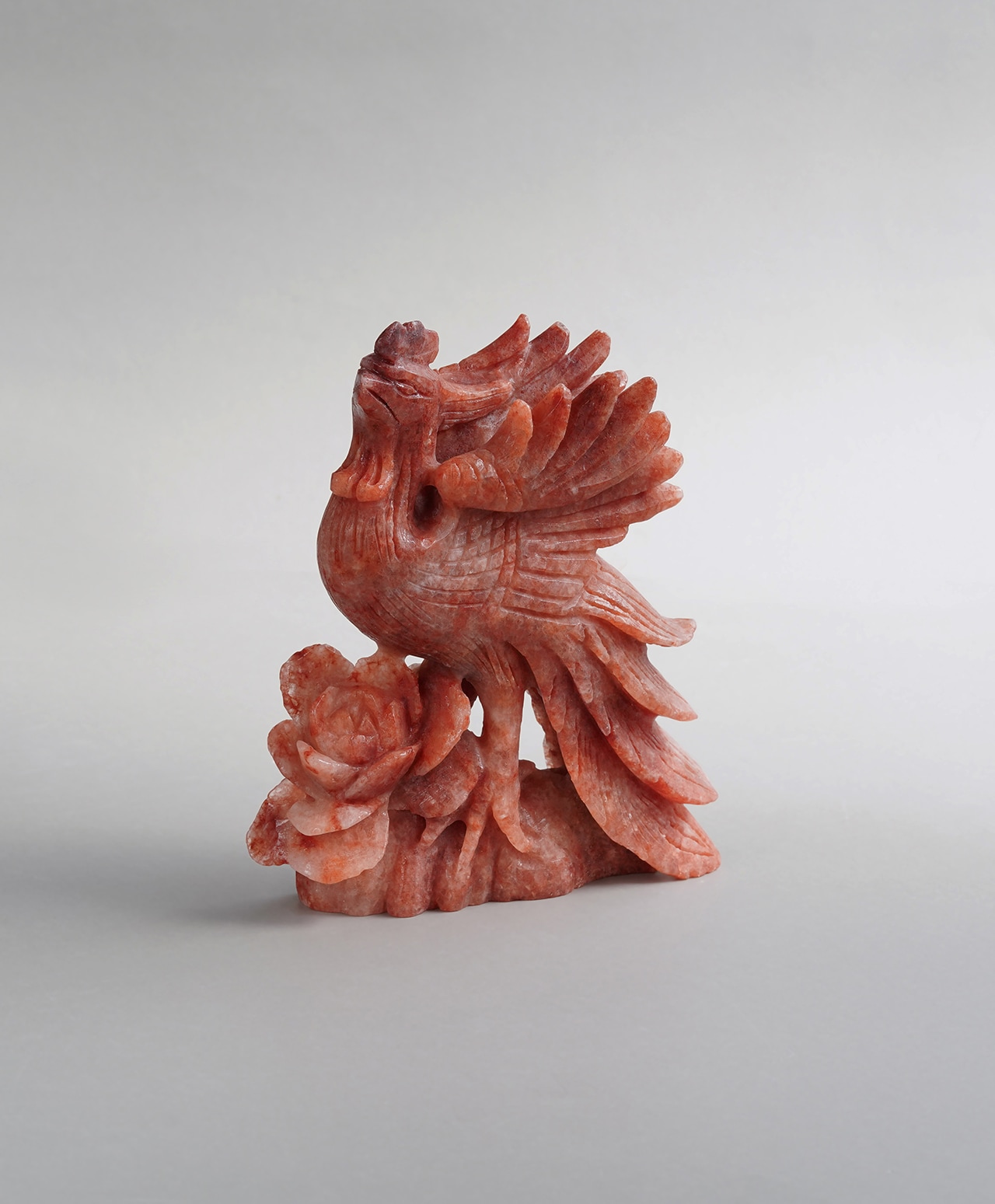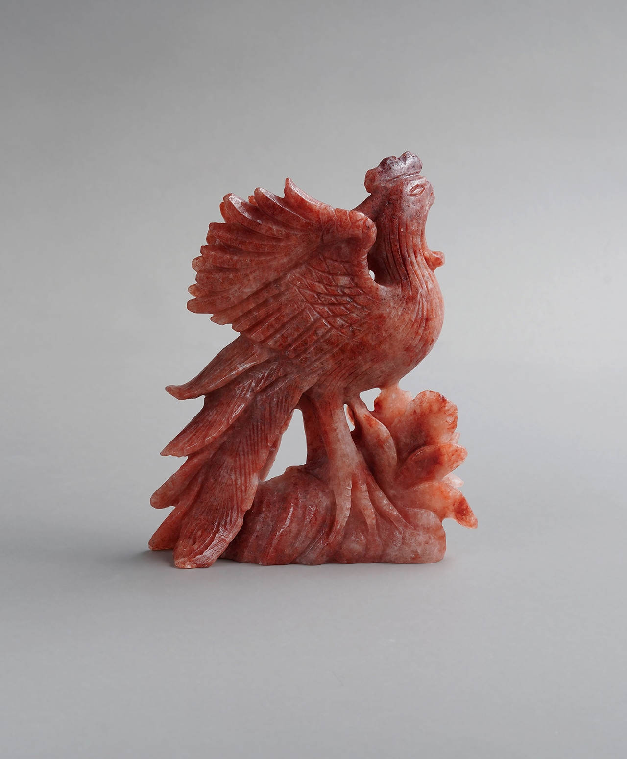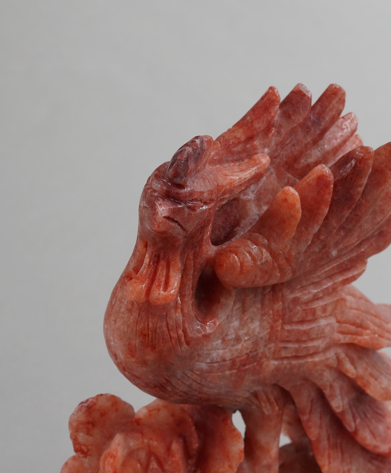 羽の一枚一枚に至るまで刻まれた力強い彫りが、白い灰の中から炎をまとって蘇る火の鳥そのものの気迫を宿し、見る者に圧倒的なエネルギーをもたらす、唯一無二の逸品です。