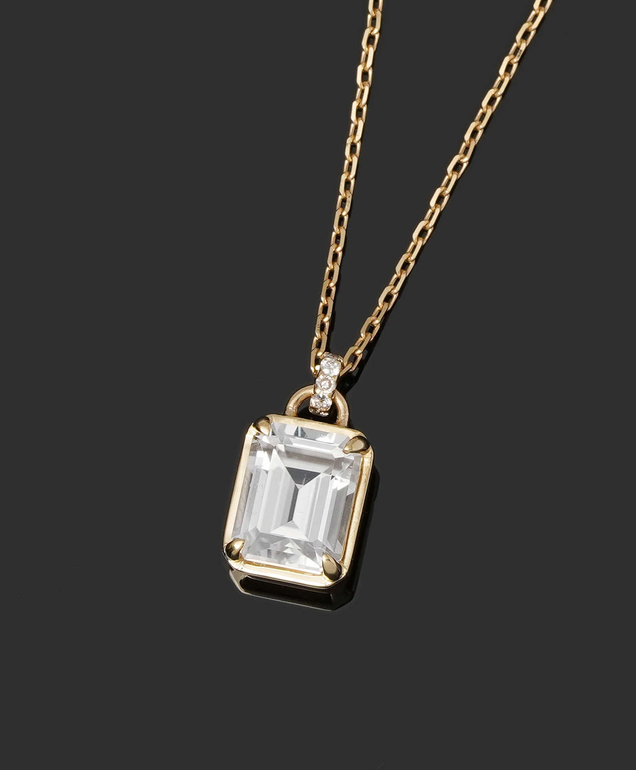 純粋な透明感を余すところなく表現する、洗練されたエメラルドカットに仕立て、バチカンに散りばめられたダイヤモンドが華やかな煌めきを添えました。