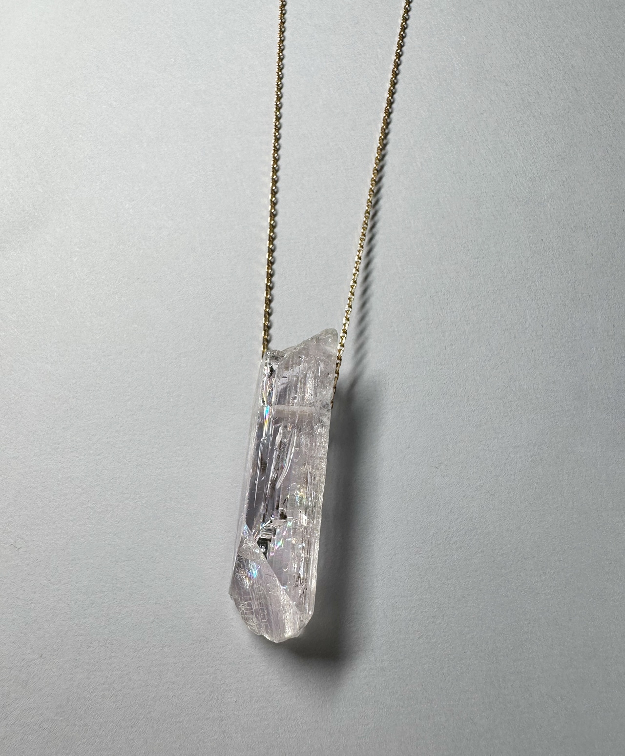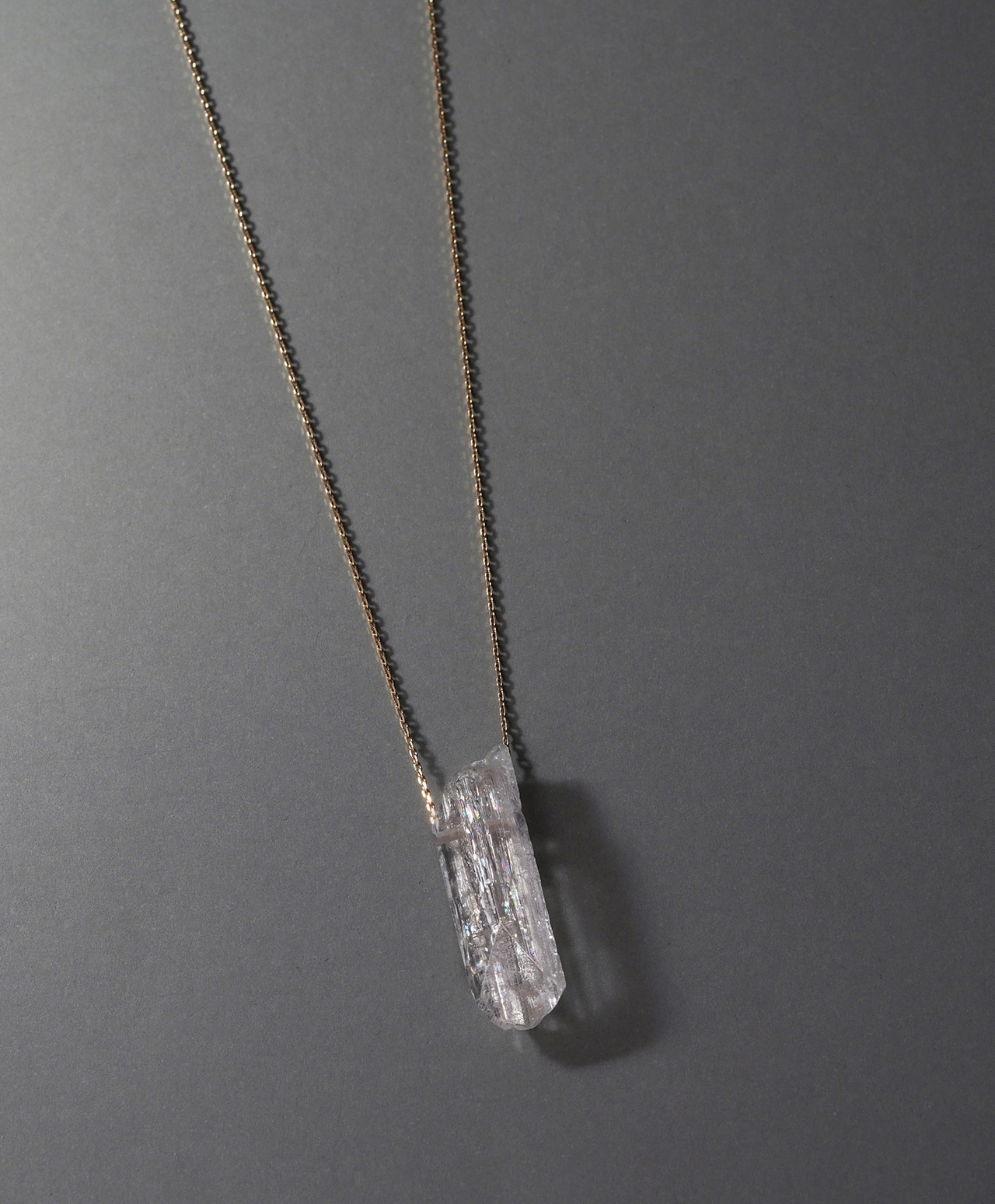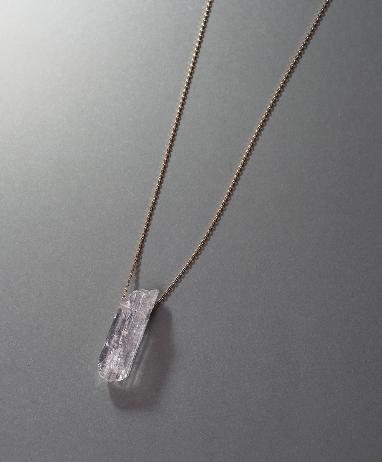 原石の自然な造形をそのまま活かした姿は、石が生まれたままの純粋さを宿しているかのよう。透明感のある柔らかな色合いと、繊細な輝きが織りなす儚げな美しさが、胸元に静かな存在感を添えます。
