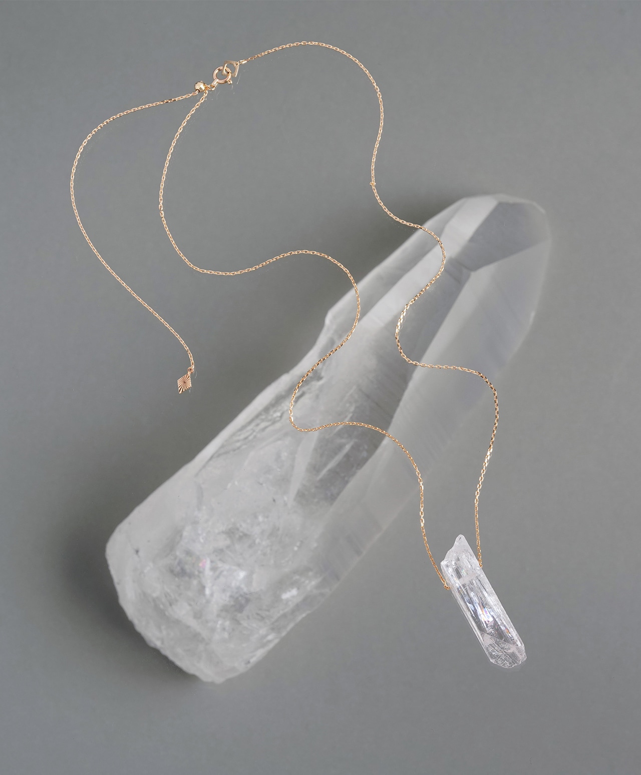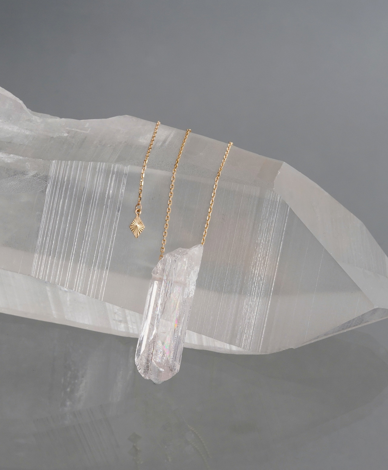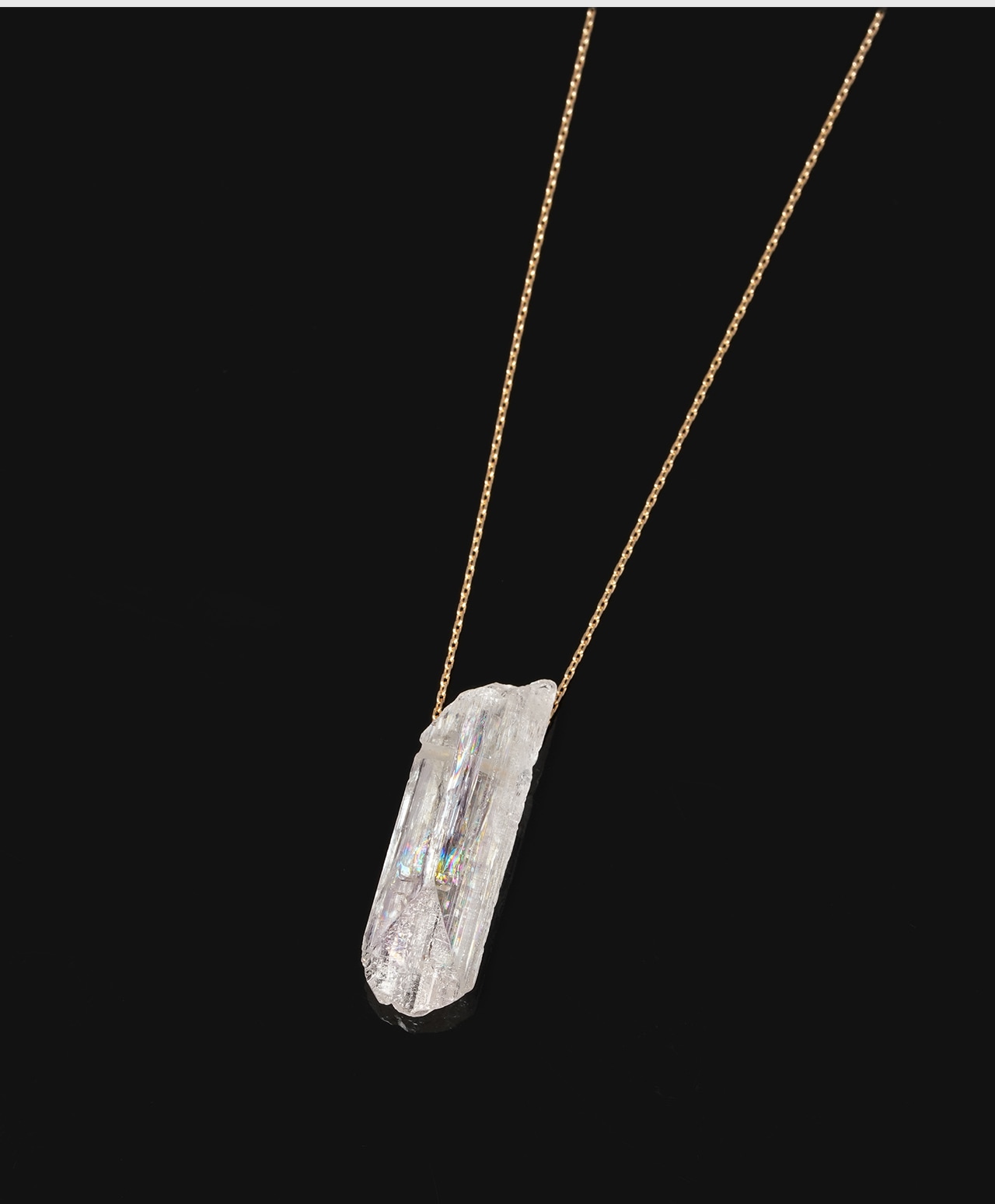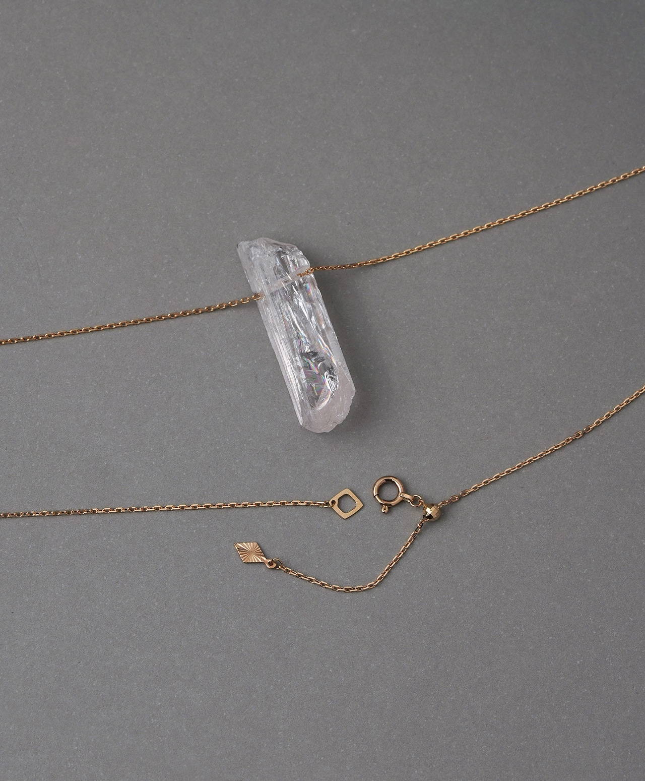 原石の自然な造形をそのまま活かした姿は、石が生まれたままの純粋さを宿しているかのよう。透明感のある柔らかな色合いと、繊細な輝きが織りなす儚げな美しさが、胸元に静かな存在感を添えます。