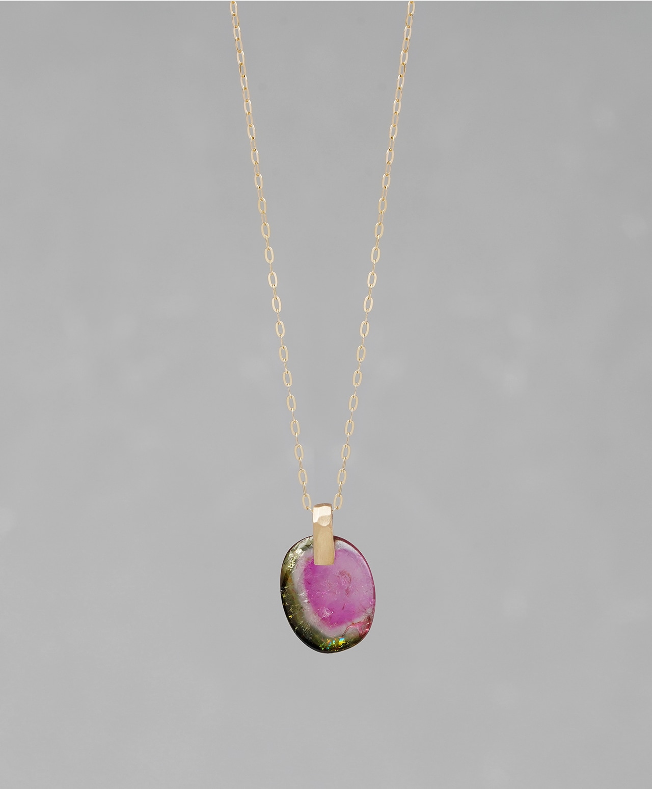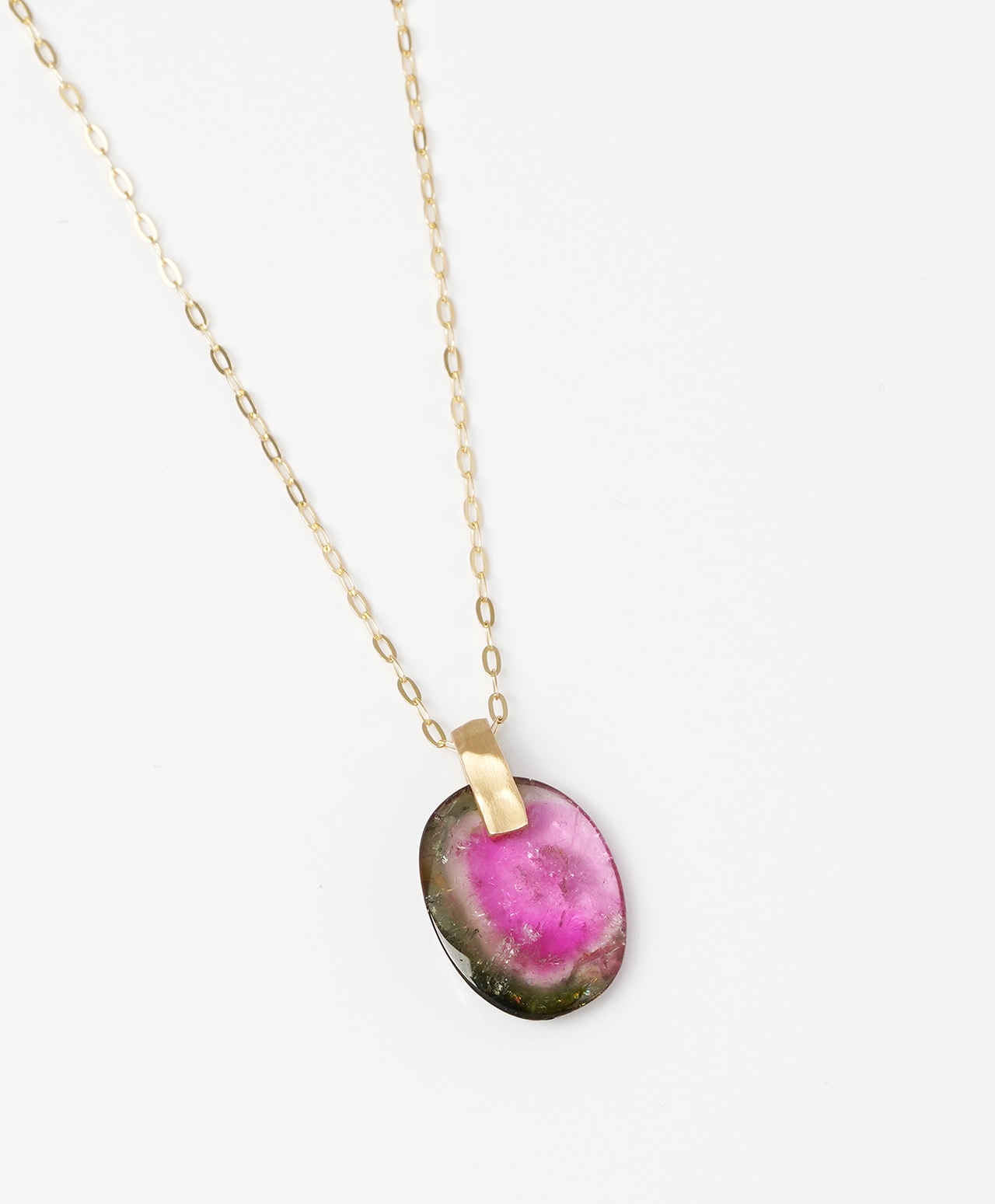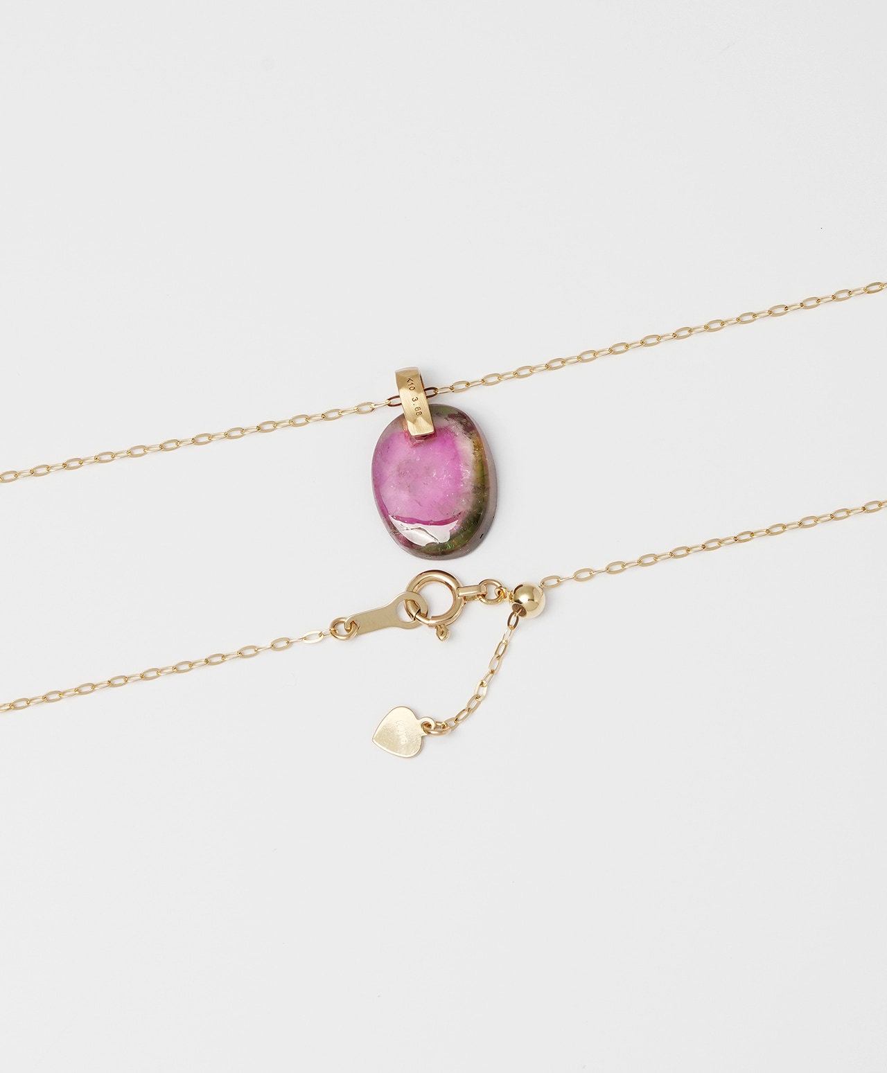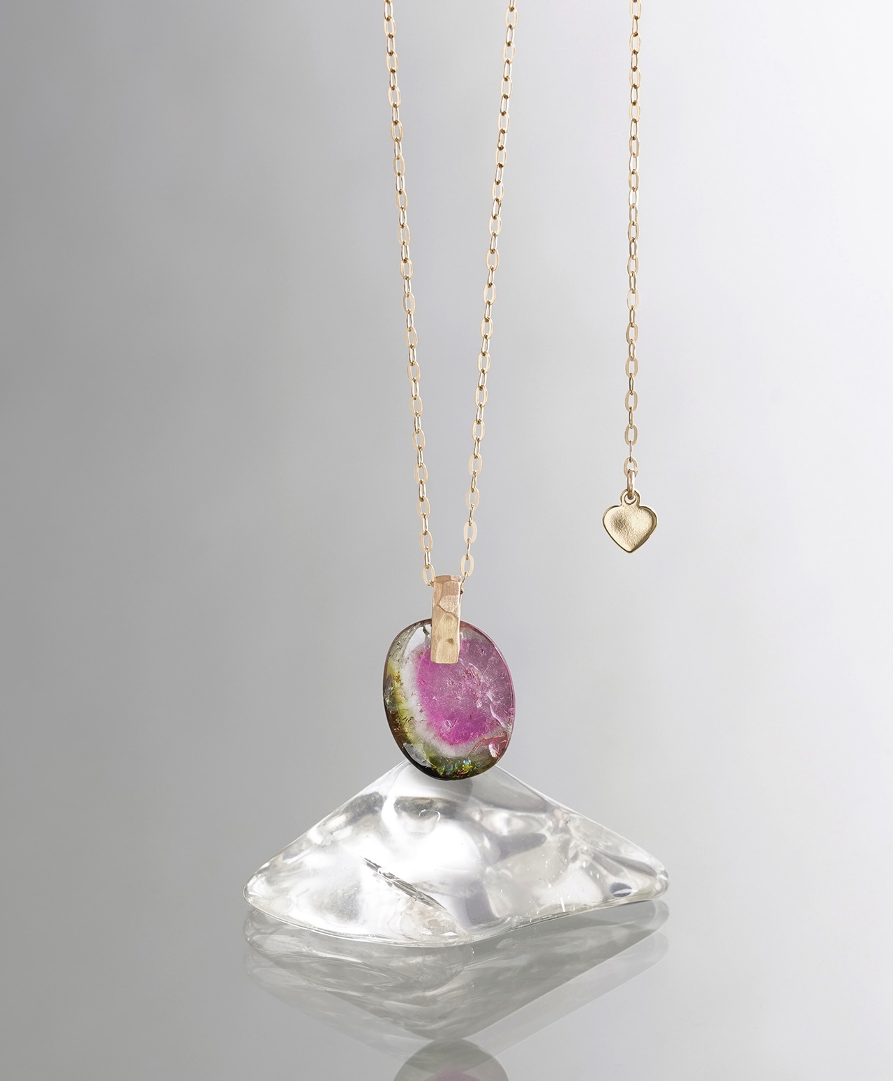 ウォーターメロンとも呼ばれるこちらのトルマリンの個性的な美しさは見ていて飽きることがありません。10金のバチカン部分には槌目加工を加え、エンドチェーンの先端には柔らかいハートのアクセントを加えました。