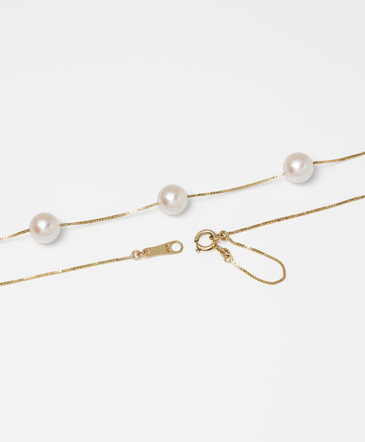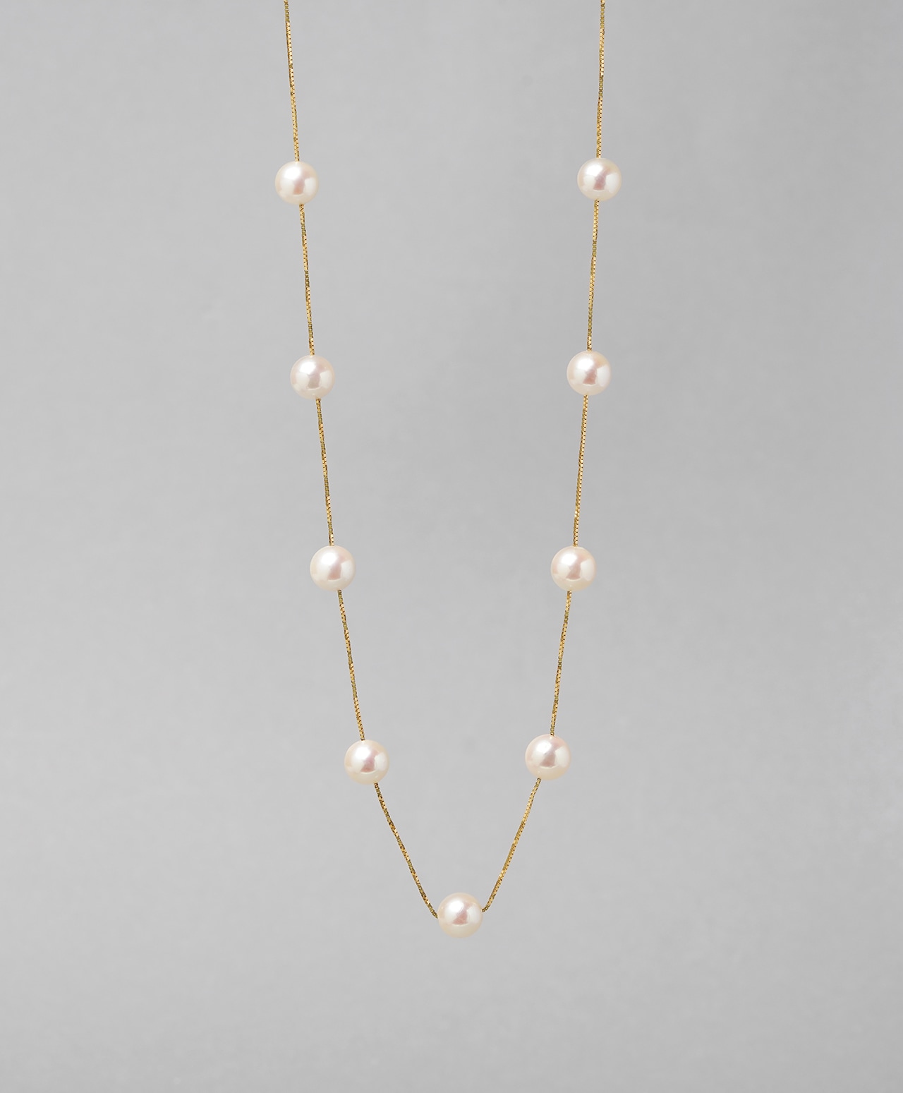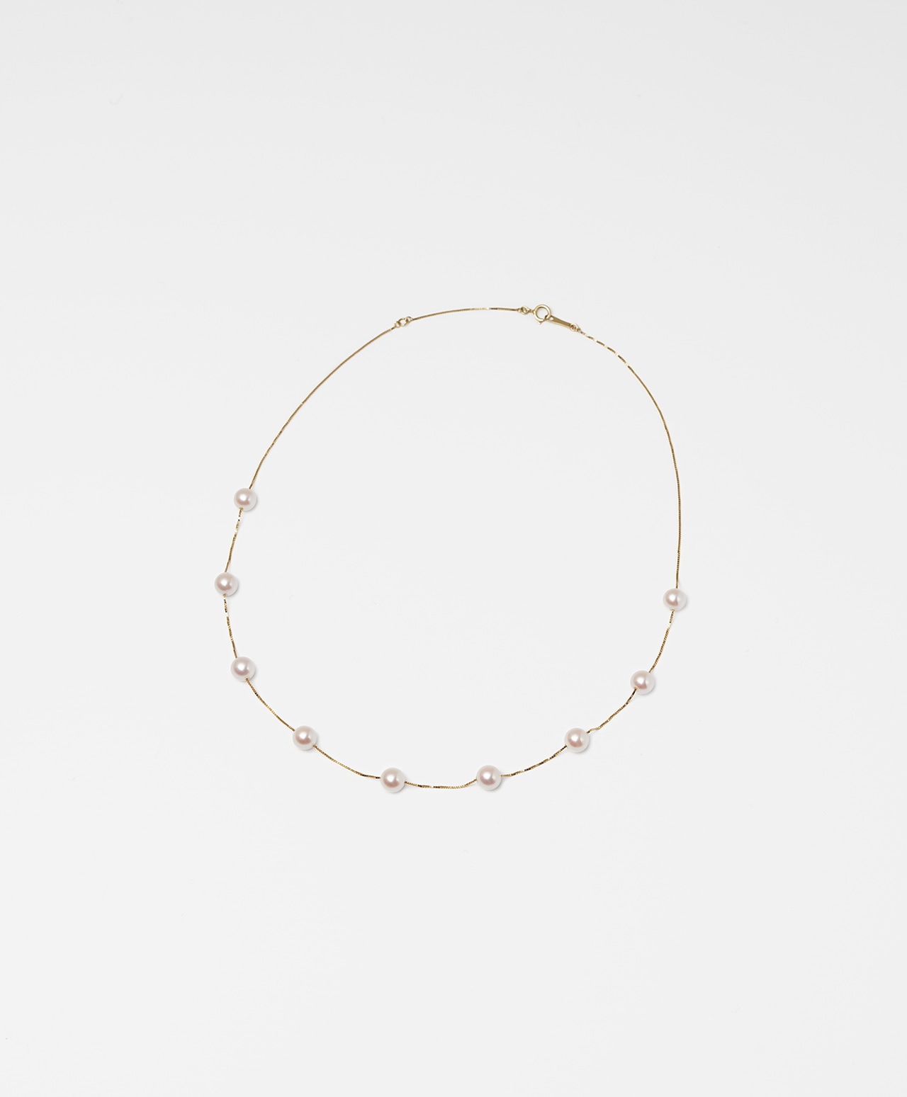 こちらは、冬の夜明けに淡く輝く星のような、清潔感あふれる白さを湛える白真珠(パール)。ほんのりとピンクを帯びた玉肌が、細いゴールドチェーンの上に等間隔に連なり、首元にさりげなく上品な光をちりばめます。