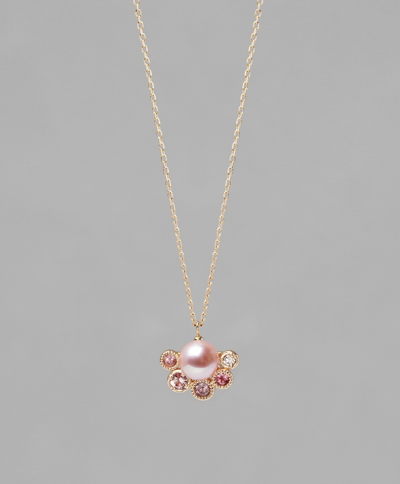 こちらは、淡い桜色を湛えたピンク真珠。その下に扇形に寄り添うように、ピンクサファイア、ピンクジルコン、ピンクトルマリン、ピンクダイヤモンドが大小の輝きを放ち、胸元に咲く小花のような愛らしさを演出しています。