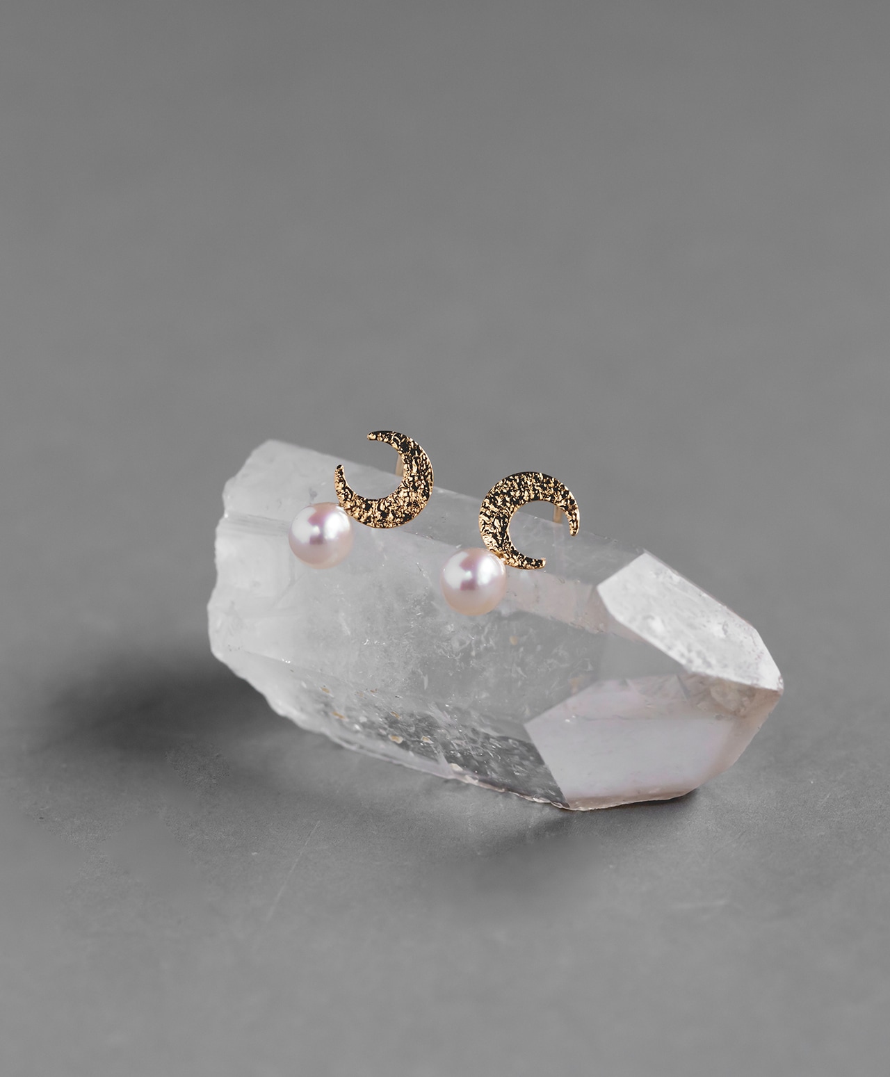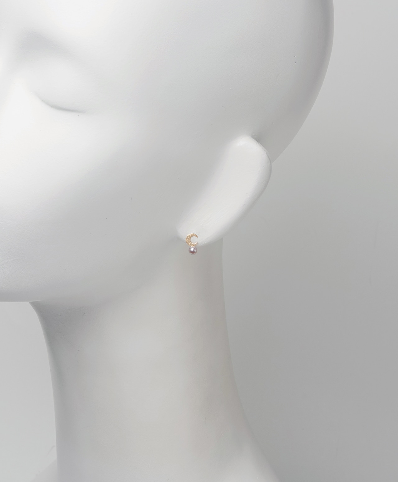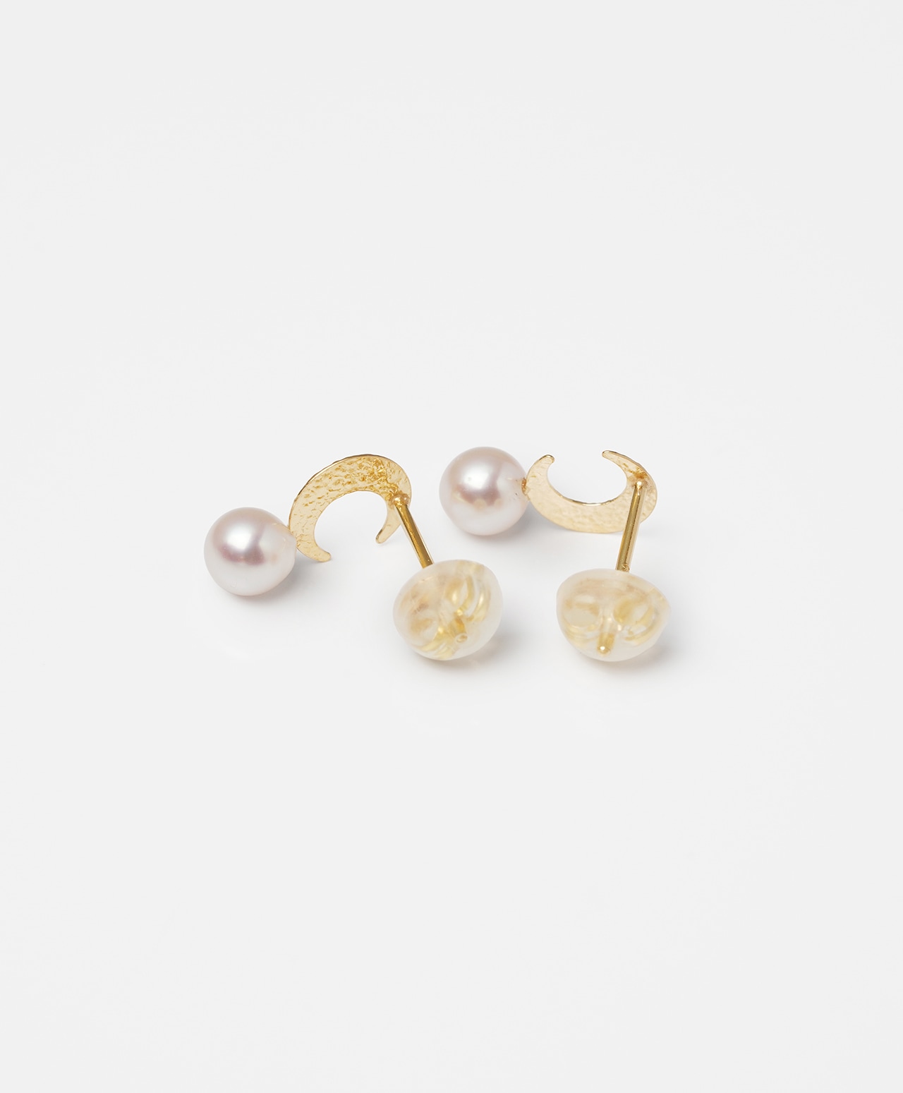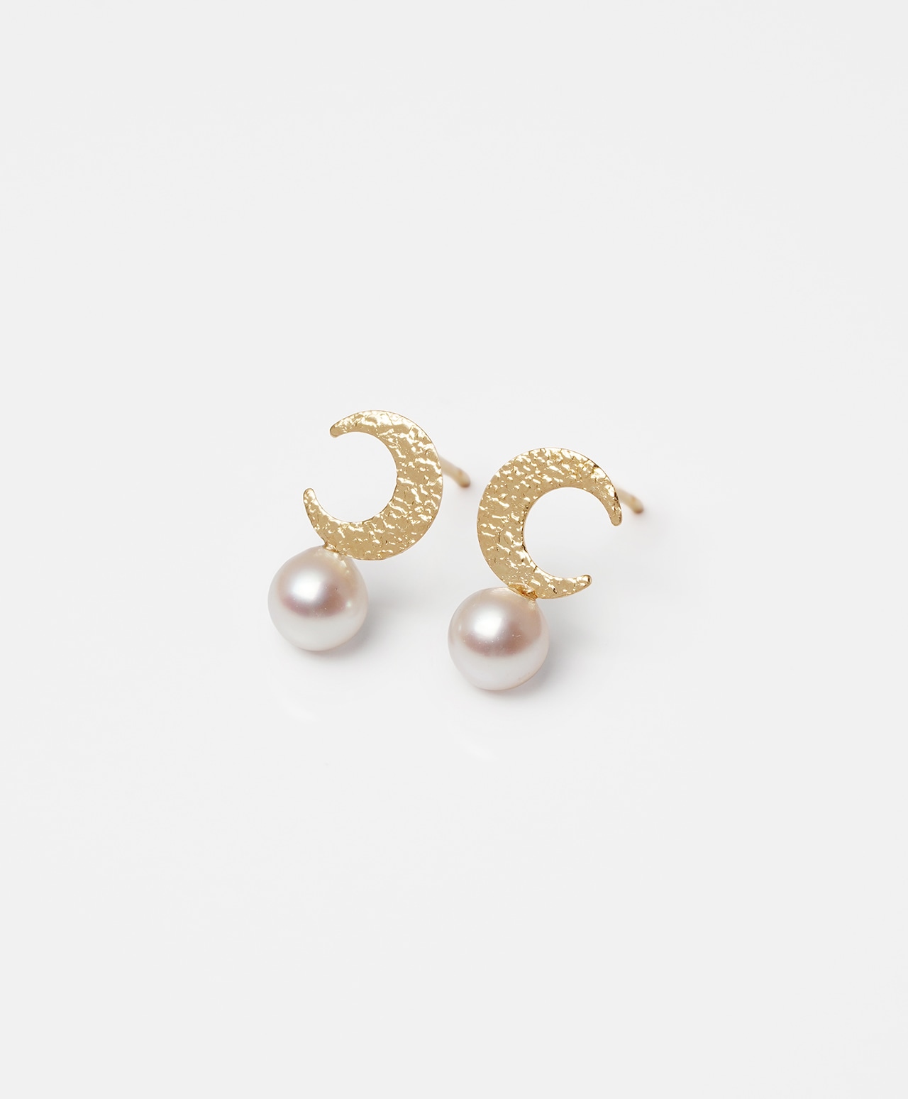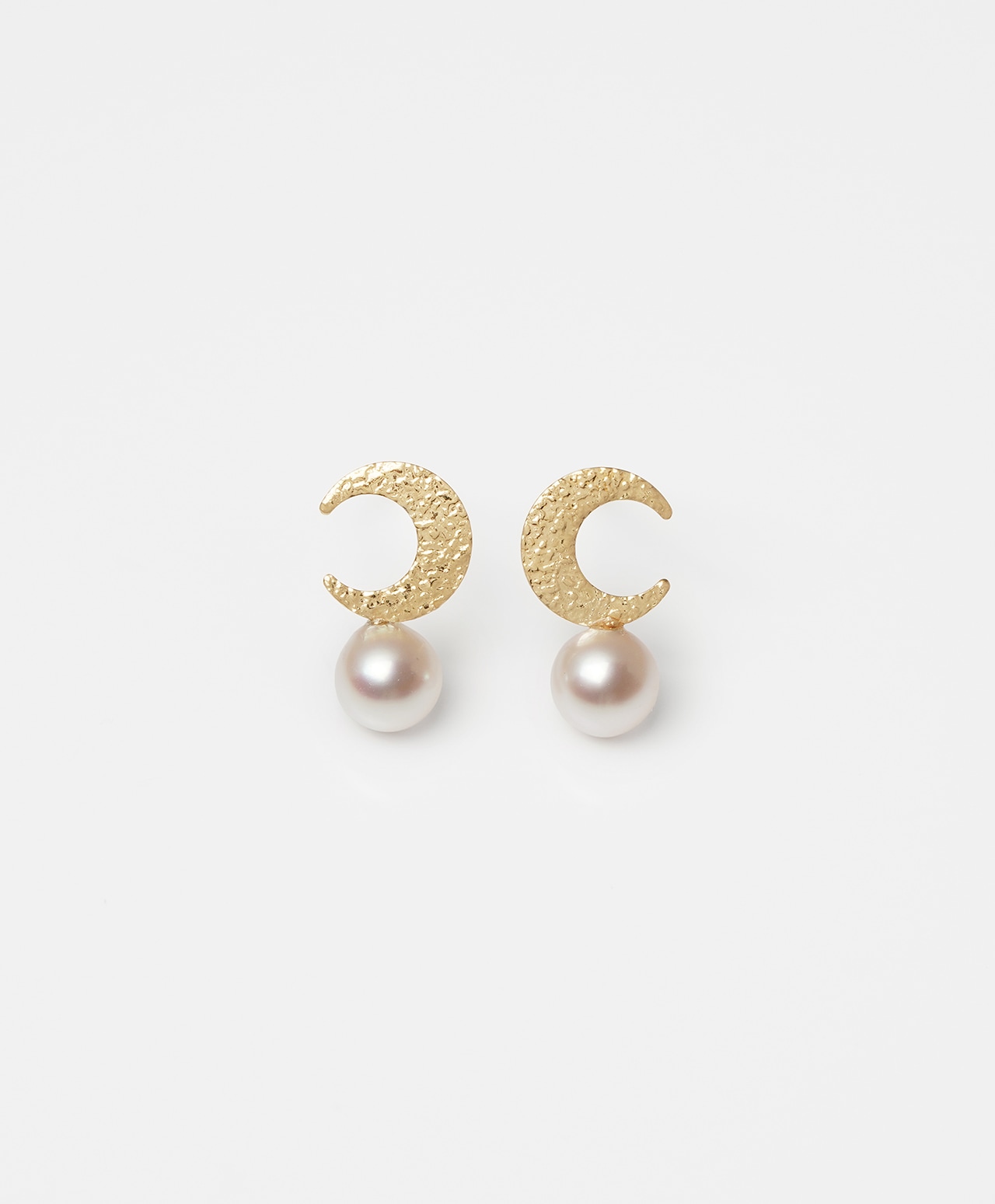 ゴールドの三日月が、白真珠(パール)をやさしく抱くように添えたピアス。槌目加工が施され、素朴な温かみを宿す月とつややかな真珠の上品な光沢が、互いの美しさを引き立て合い、耳元に静かで詩的な存在感をもたらします。