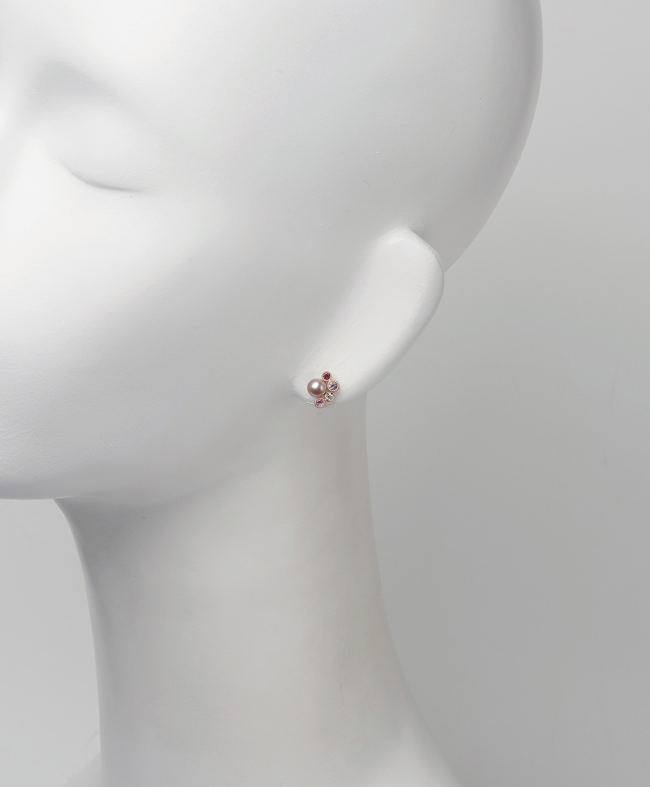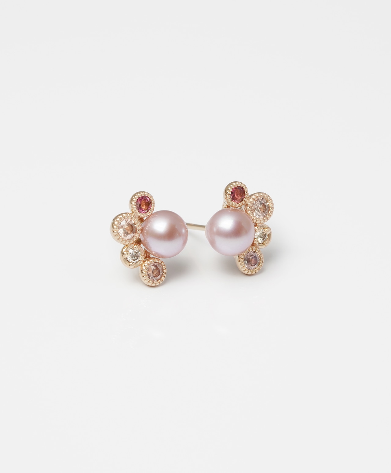 こちらは、朝焼けに透ける桜の花びらのような、上品な光沢と清楚な照りを湛えるピンク真珠。その周囲を、ピンクサファイア、ピンクジルコン、ピンクトルマリン、ピンクダイヤモンドが弧を描くように取り囲み、耳元に花が咲いたような華やかさを添えています。