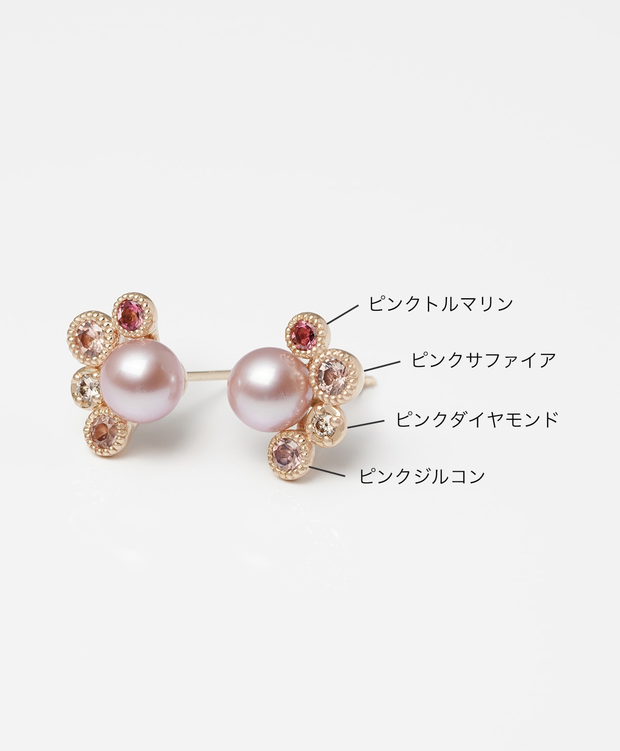 ピンク真珠(パール):約5.5mm × 約5.5mm ピンクトルマリン:0.03ct、0.02ct( 約2.1mm × 約2.1mm) ピンクジルコン:0.08ct、0.08ct(約2.2mm × 約2.2mm) ピンクサファイア:0.07ct、0.07ct(約2.4mm × 約2.4mm) ピンクダイヤモンド:0.01ct、0.01ct(約1.7mm × 約1.7mm) |