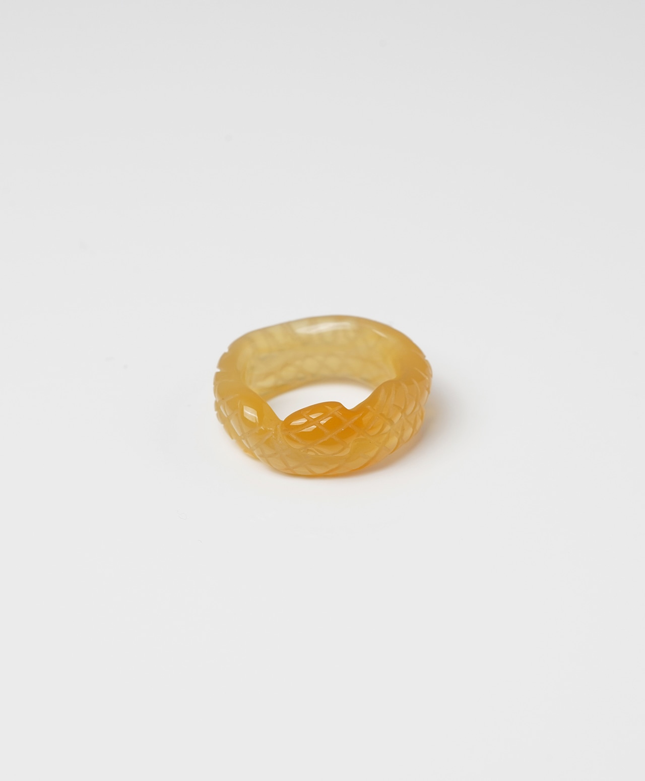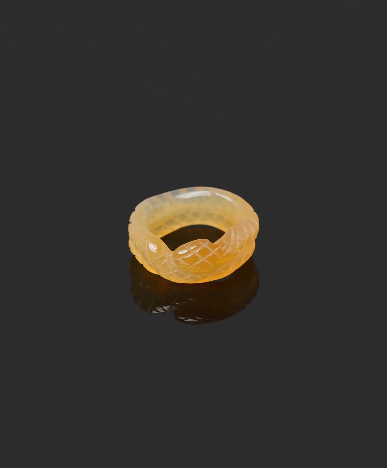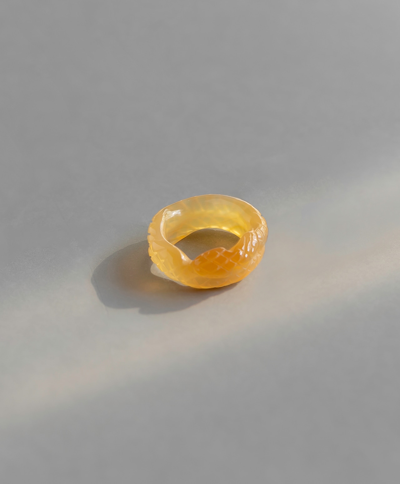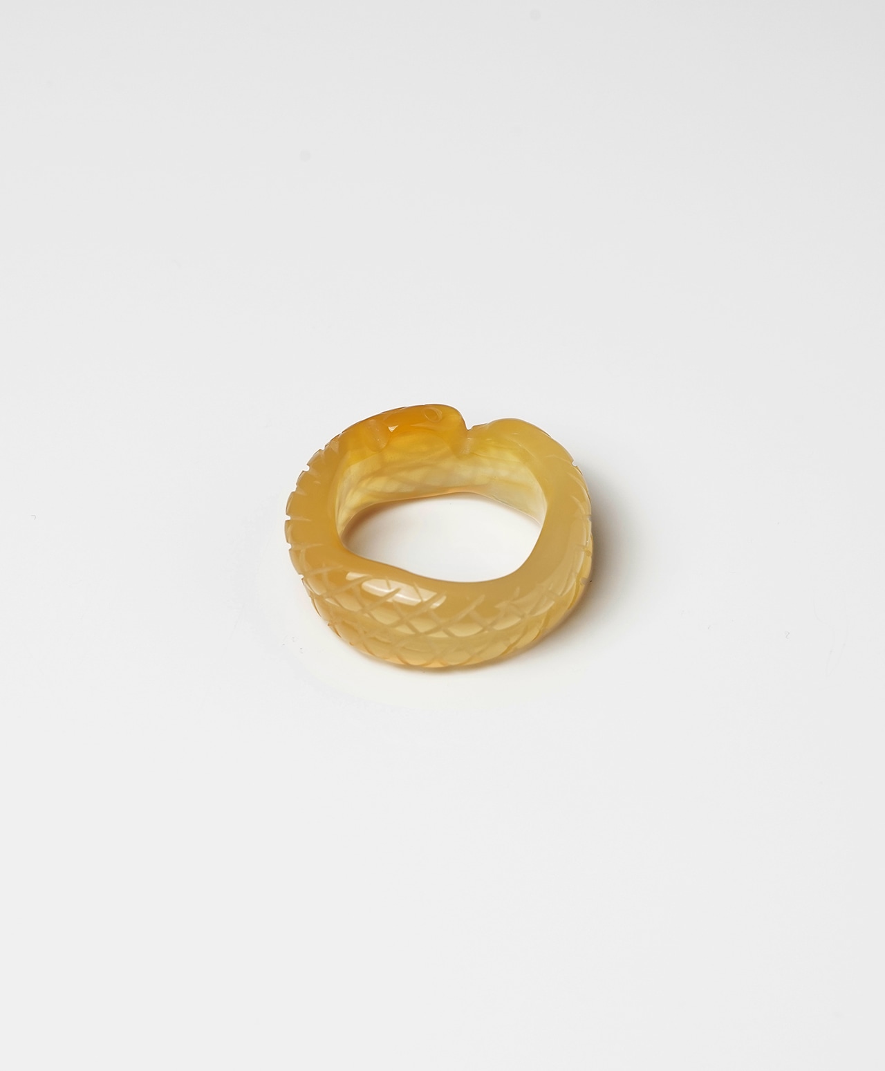 じんわりと香り立つような、温かみのあるオレンジ色が美しいカルセドニー。古来より幸運の象徴や魔除けのモチーフとして愛されてきた蛇の形に仕立てました。