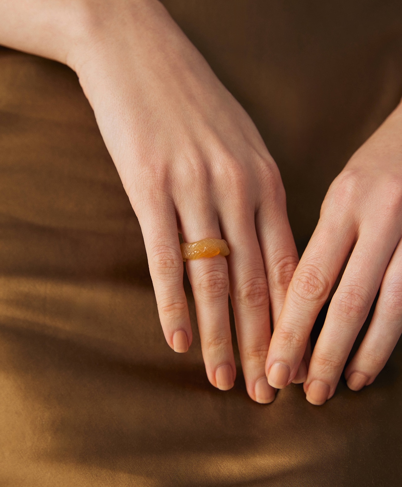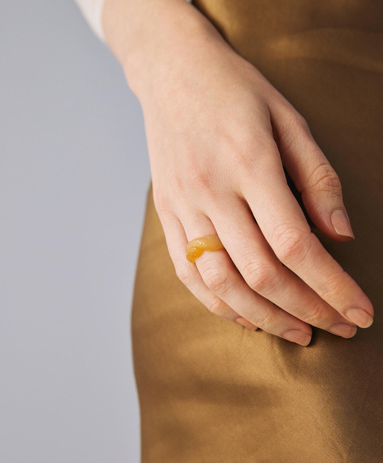 鱗を思わせる繊細な表面の質感と柔らかな光沢が、指に優しく寄り添いながら、温もりに満ちた存在感をもたらす特別なリングです。