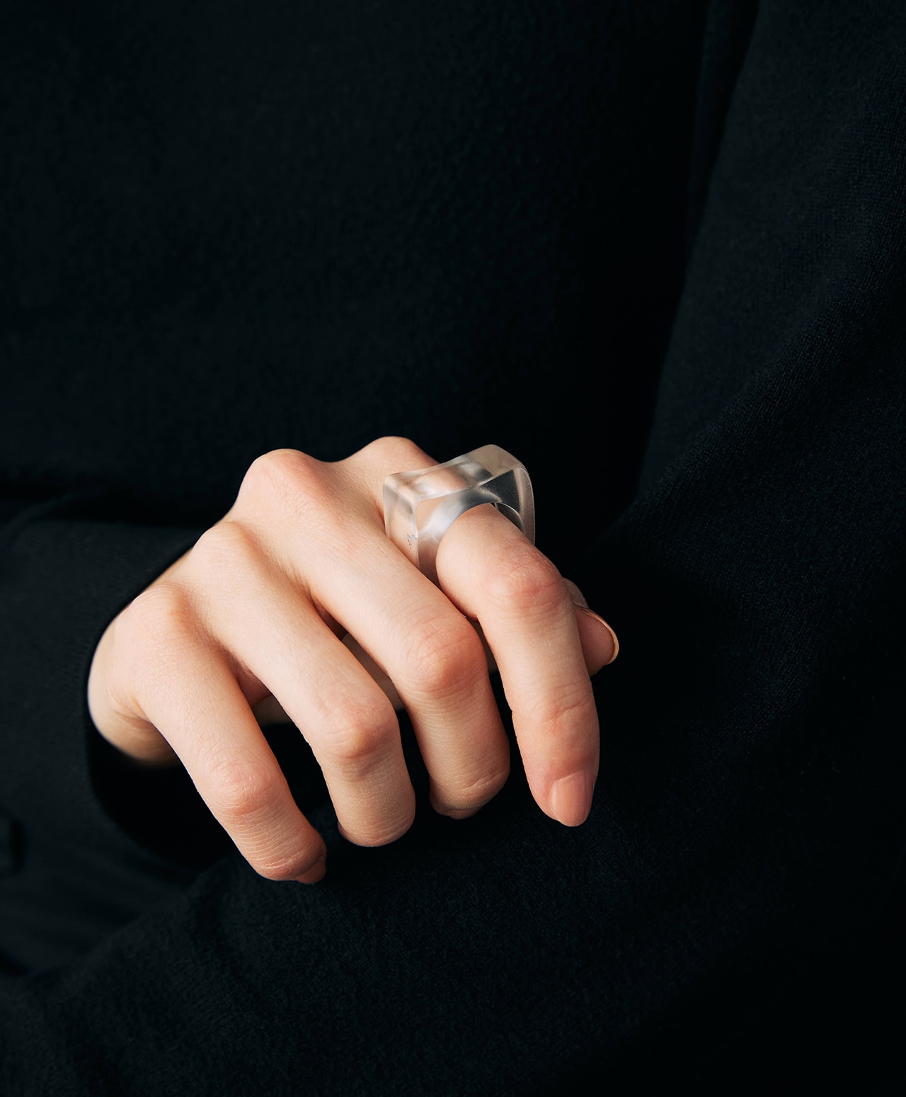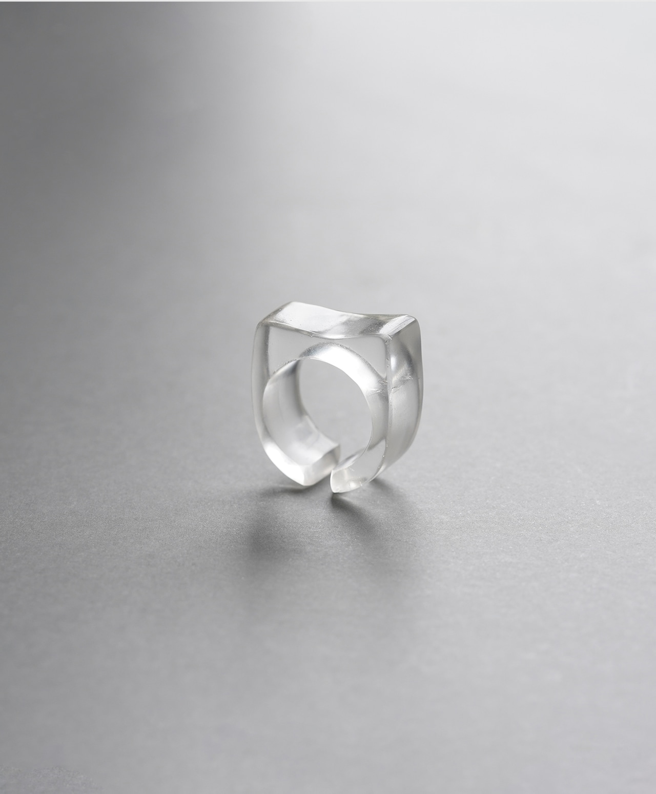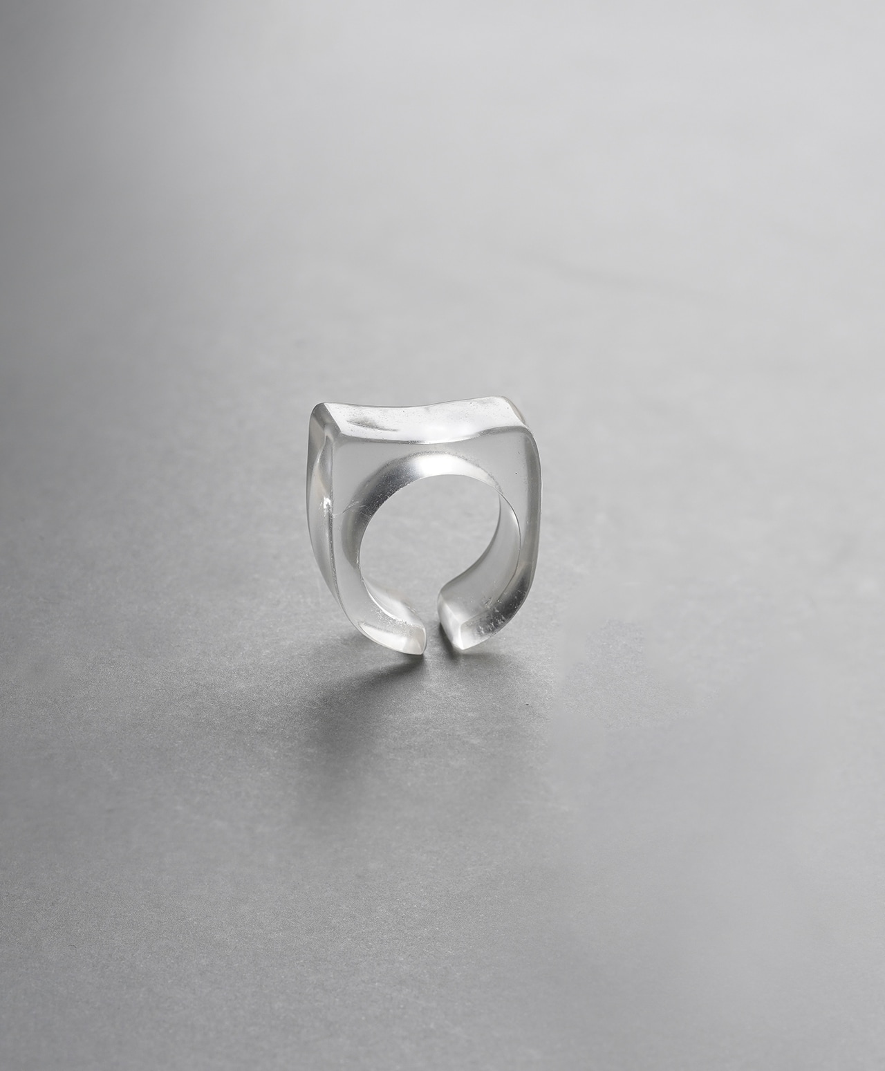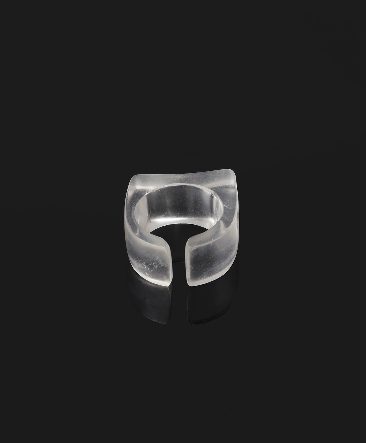 純氷を削り出したような、透明感溢れるクォーツ。中央に刻まれた円形の空洞を囲むようにスクエア型の壁が立ち上がり、まるで現代アートのような造形美を湛えています。厚みのある立体的なデザインが、指先にミニマルでありながら存在感のある、凛とした美しさをもたらす逸品です。