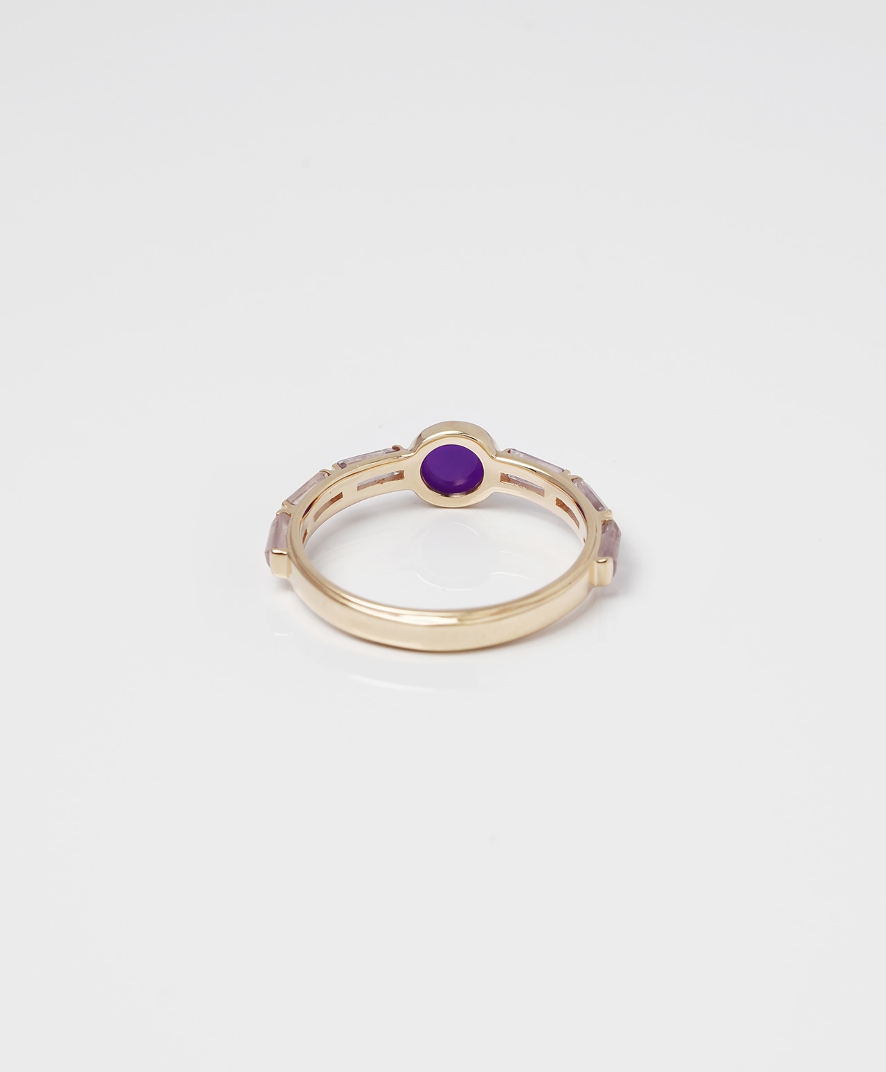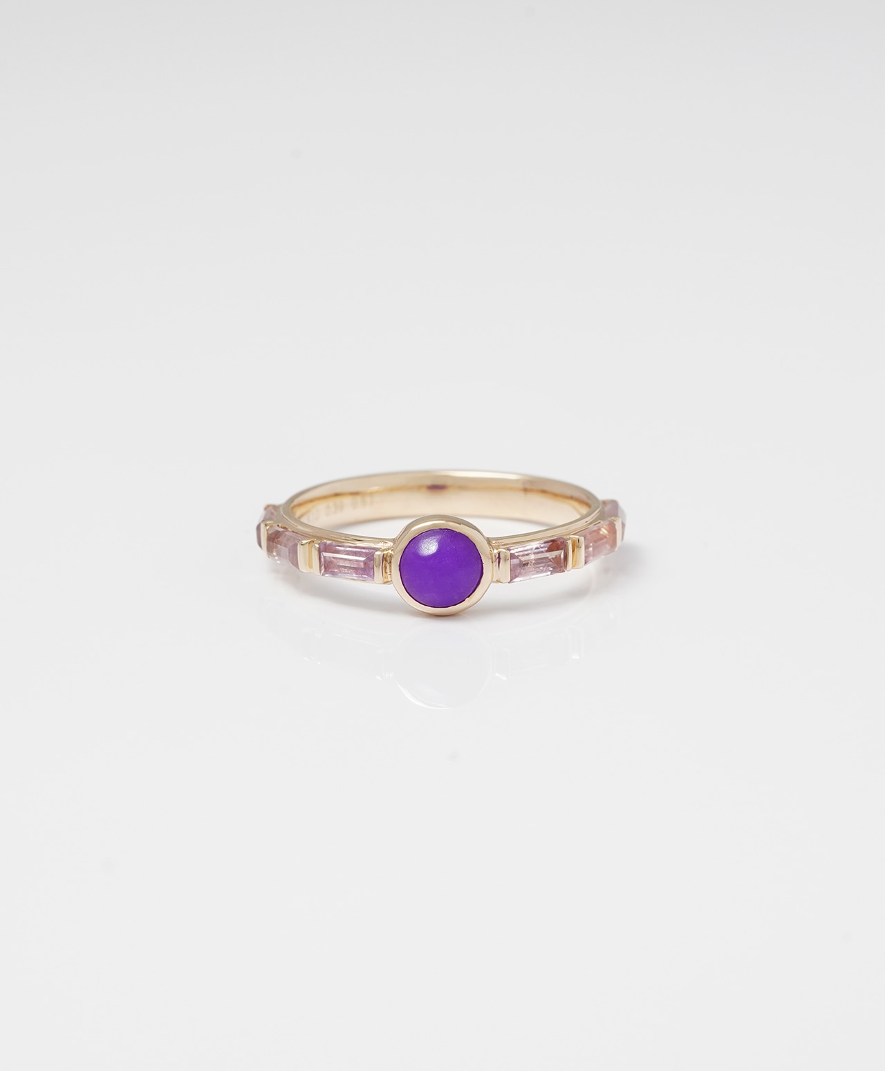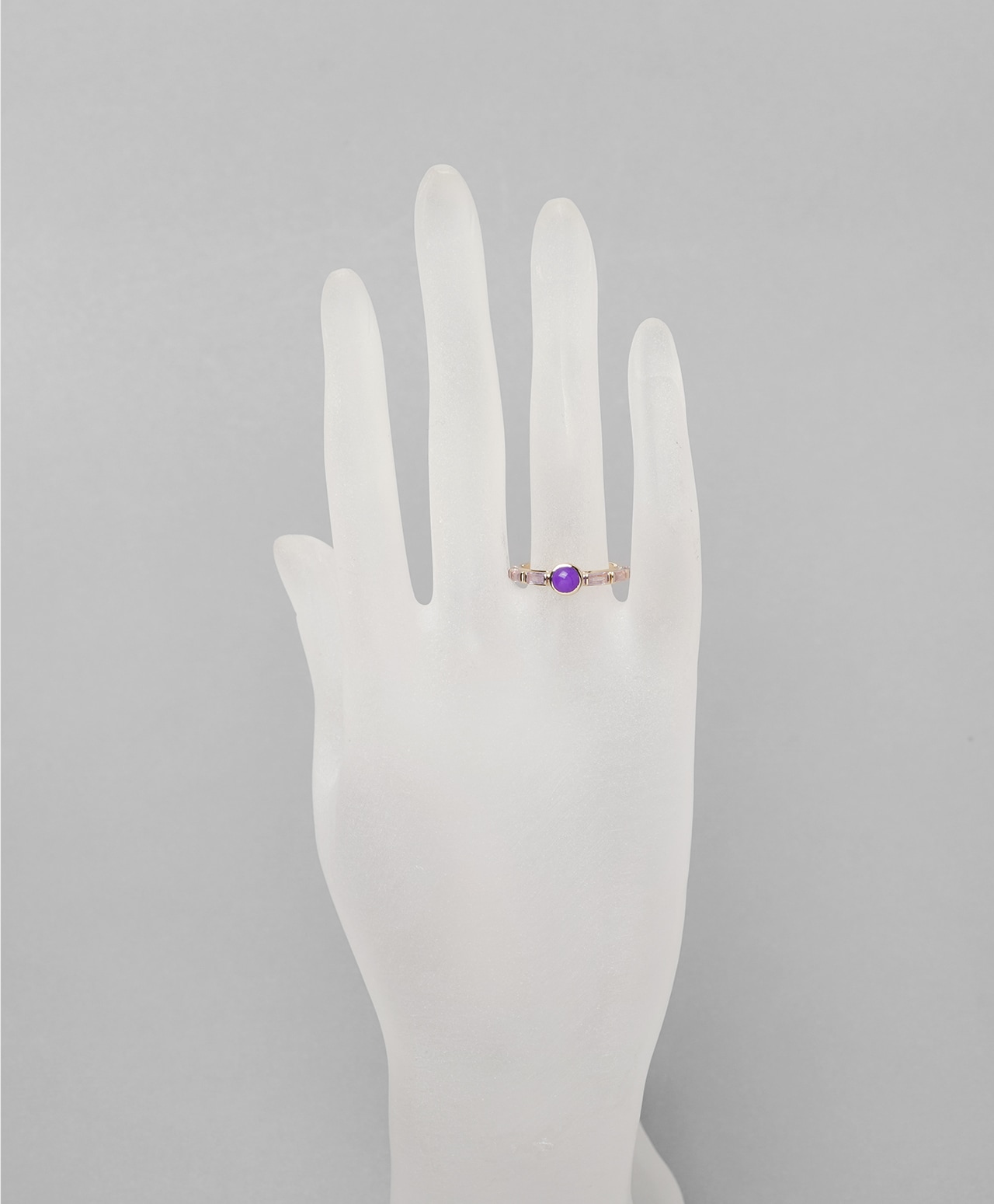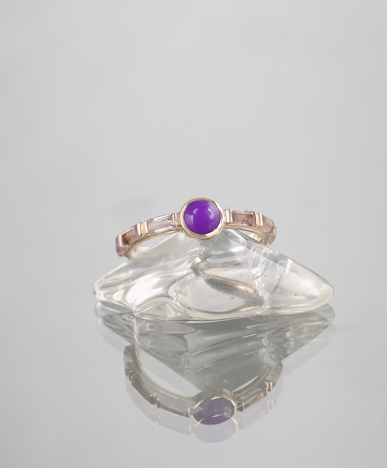オリエンタルな王冠を思わせるリングの中央には、濃厚なパープル色のスギライトが妖艶で神秘的な存在感を放ち、その両脇を淡いラベンダー色のオーラライトが優美に彩ります。