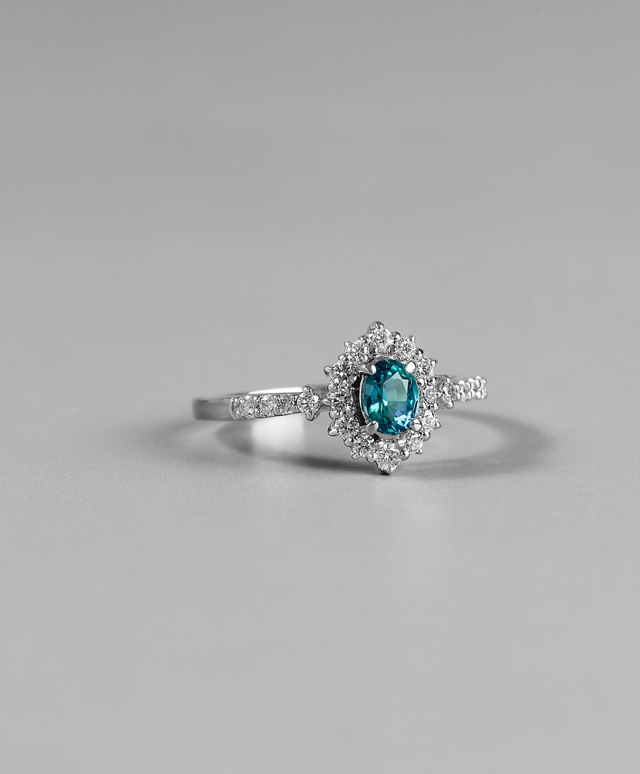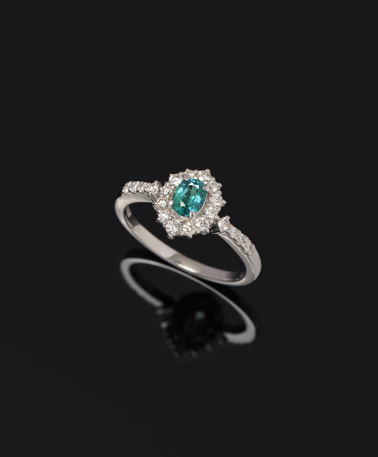 こちらは深海の宝石箱から取り出したような、鮮やかなティールグリーンの輝きを放つコーネルピン。周囲を幾重にも取り囲むダイヤモンドが放射状の光の冠を描き、深みある色彩を王冠のごとく荘厳に引き立てています。