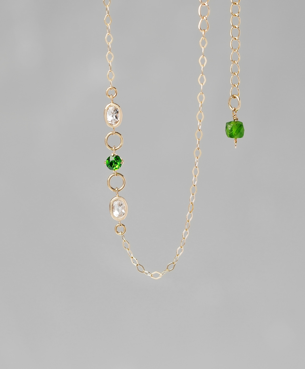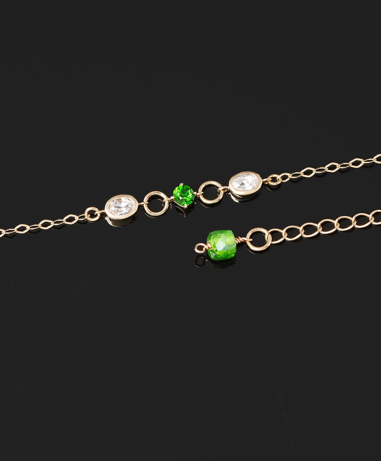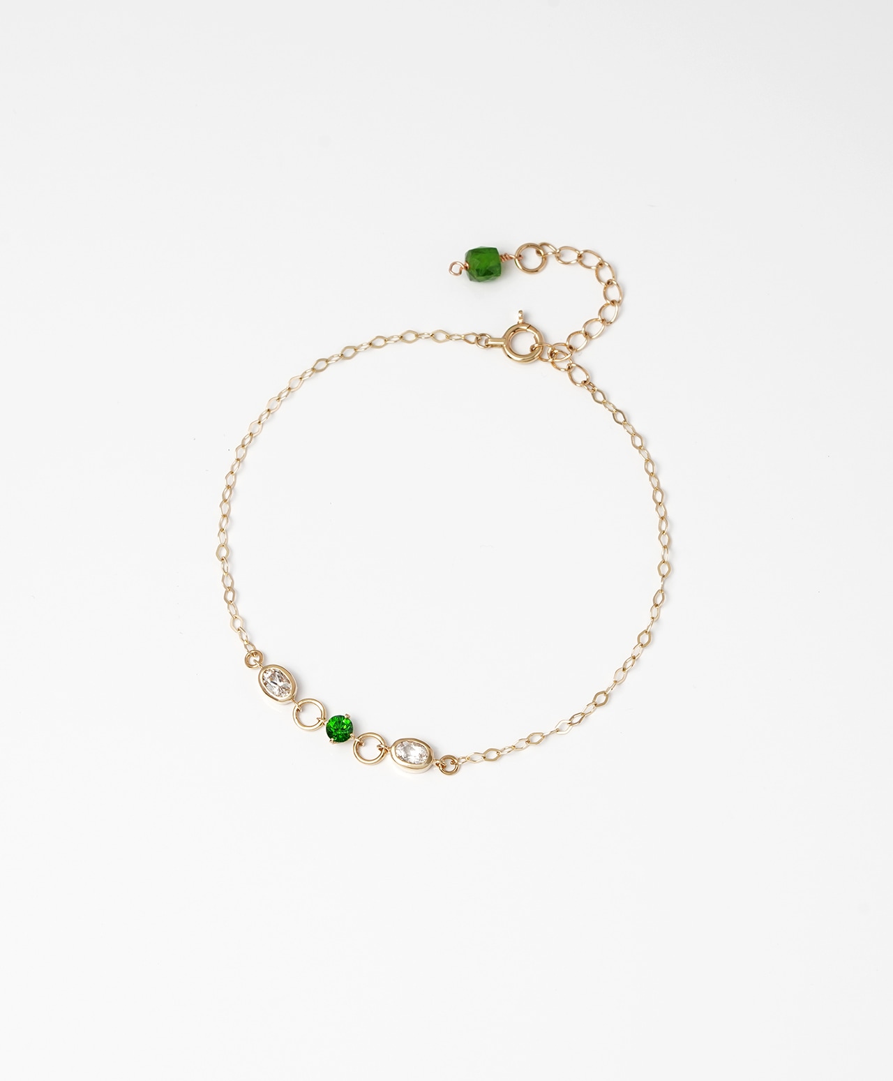 そんなフェナカイトを、新緑の森を思わせる鮮やかなクロムダイオプサイドと共に、繊細なゴールドチェーンに留めました。清廉な透明感と生命力溢れる緑が奏でる上品な煌めきが、手元に洗練された印象をもたらすブレスレットです。