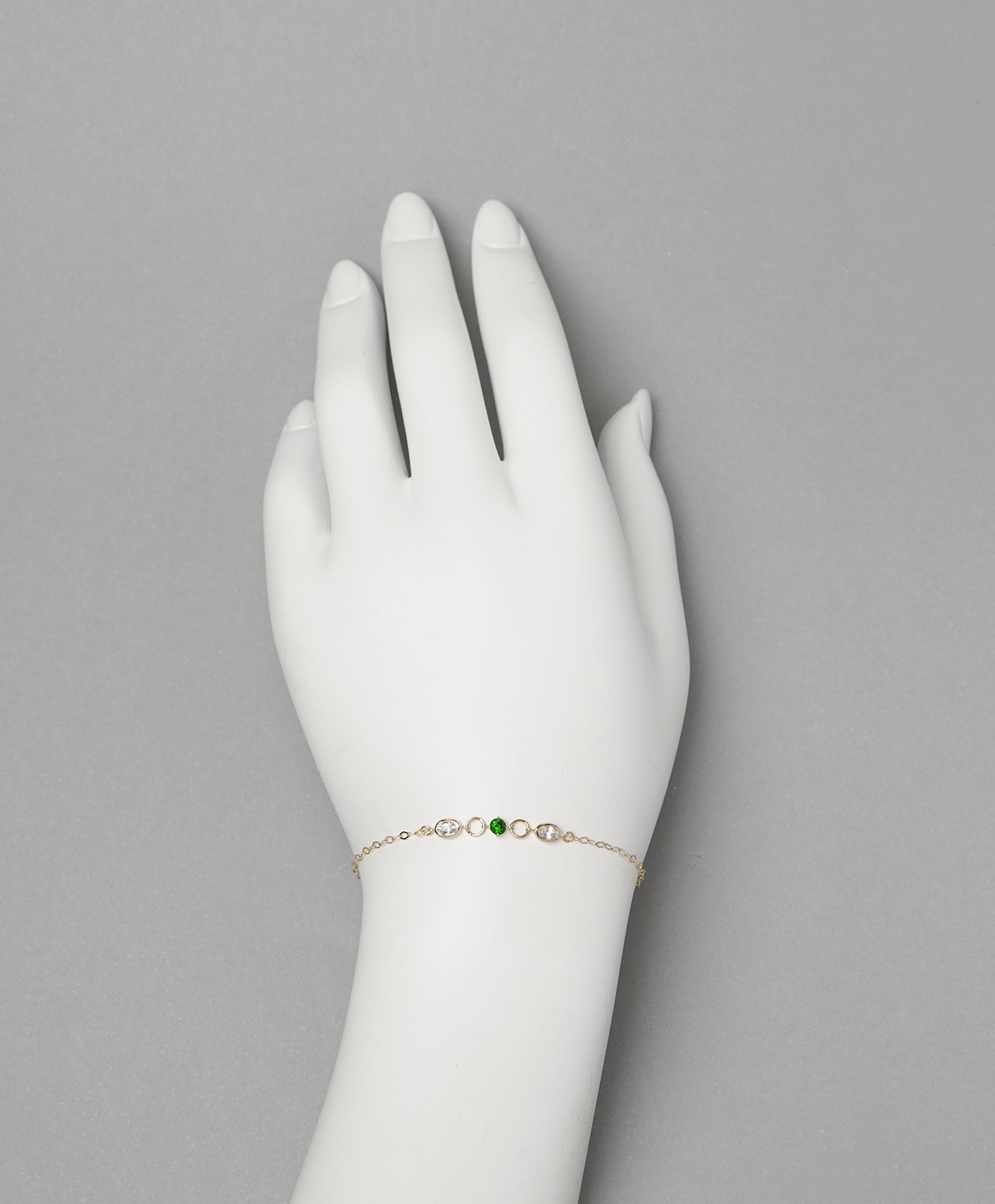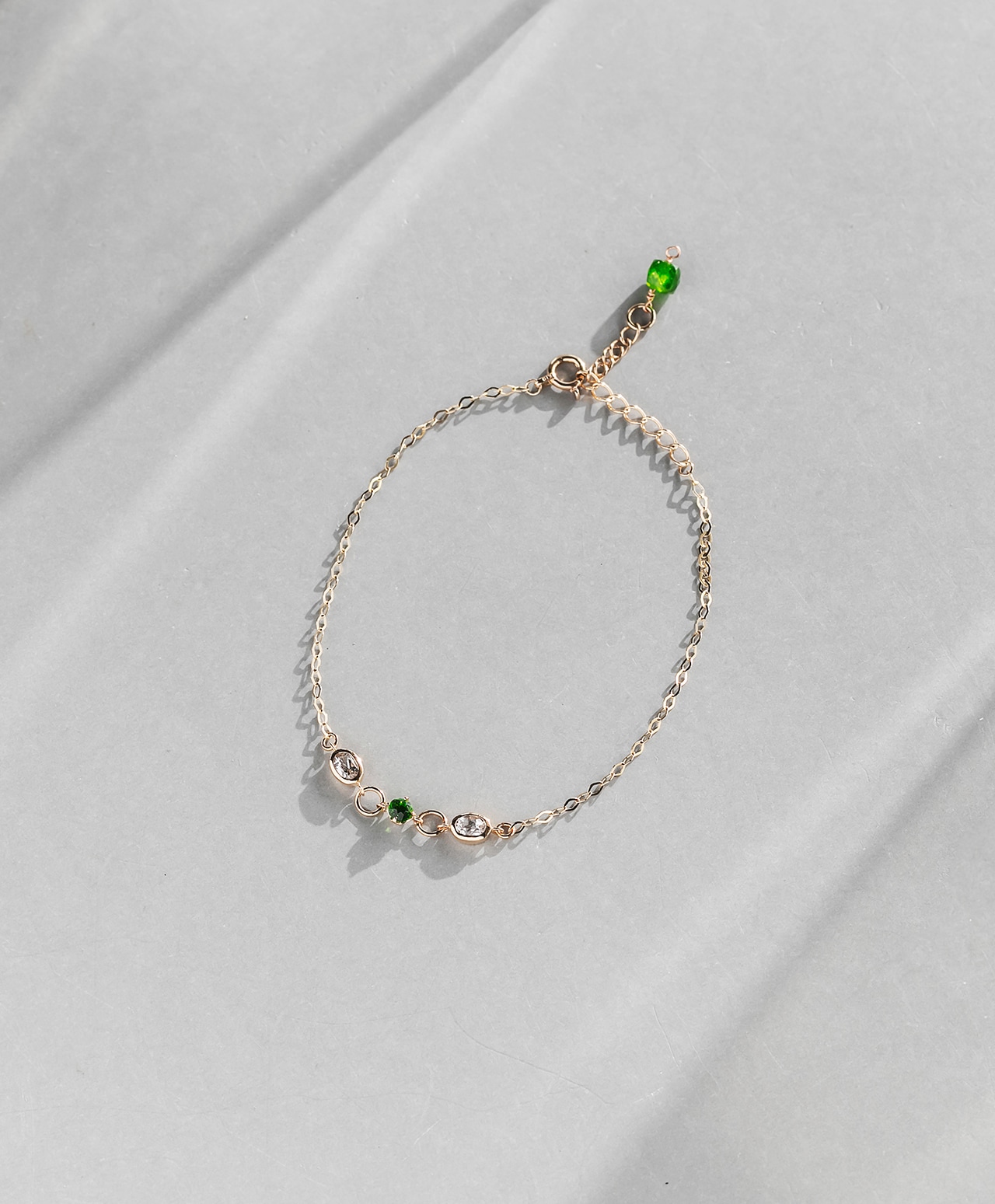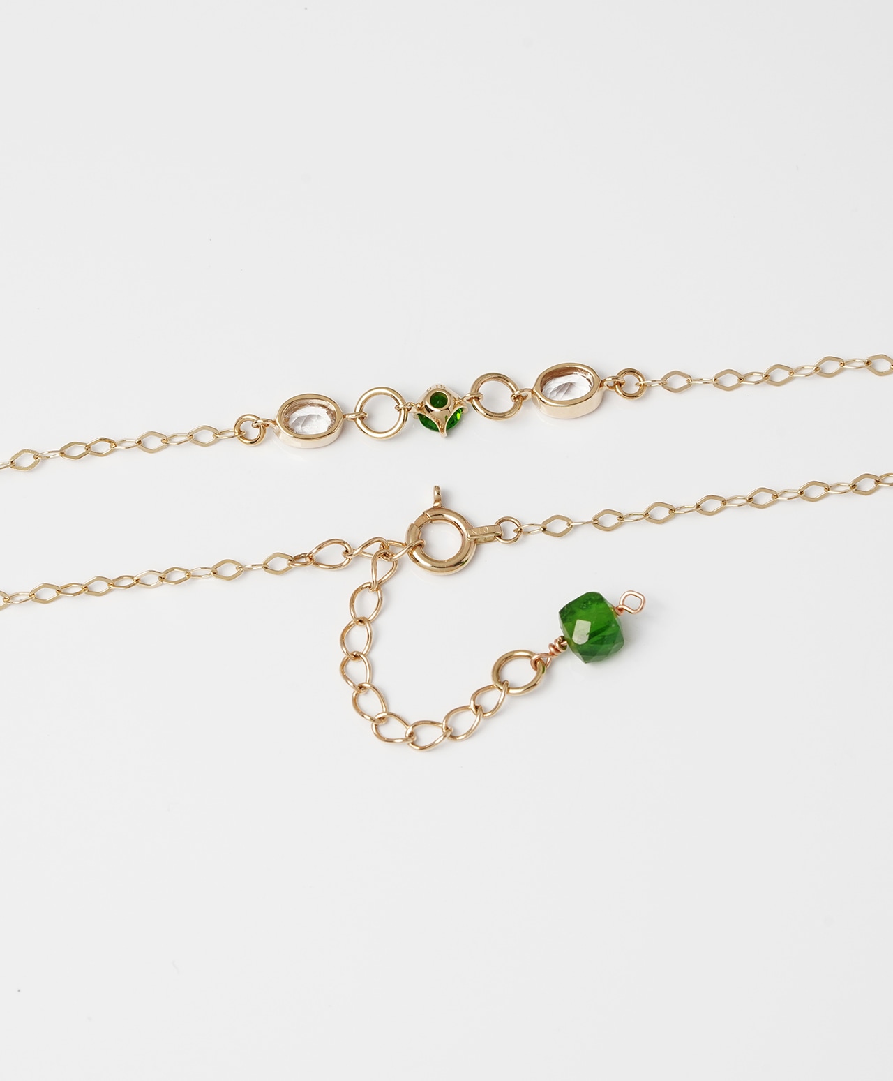 そんなフェナカイトを、新緑の森を思わせる鮮やかなクロムダイオプサイドと共に、繊細なゴールドチェーンに留めました。清廉な透明感と生命力溢れる緑が奏でる上品な煌めきが、手元に洗練された印象をもたらすブレスレットです。