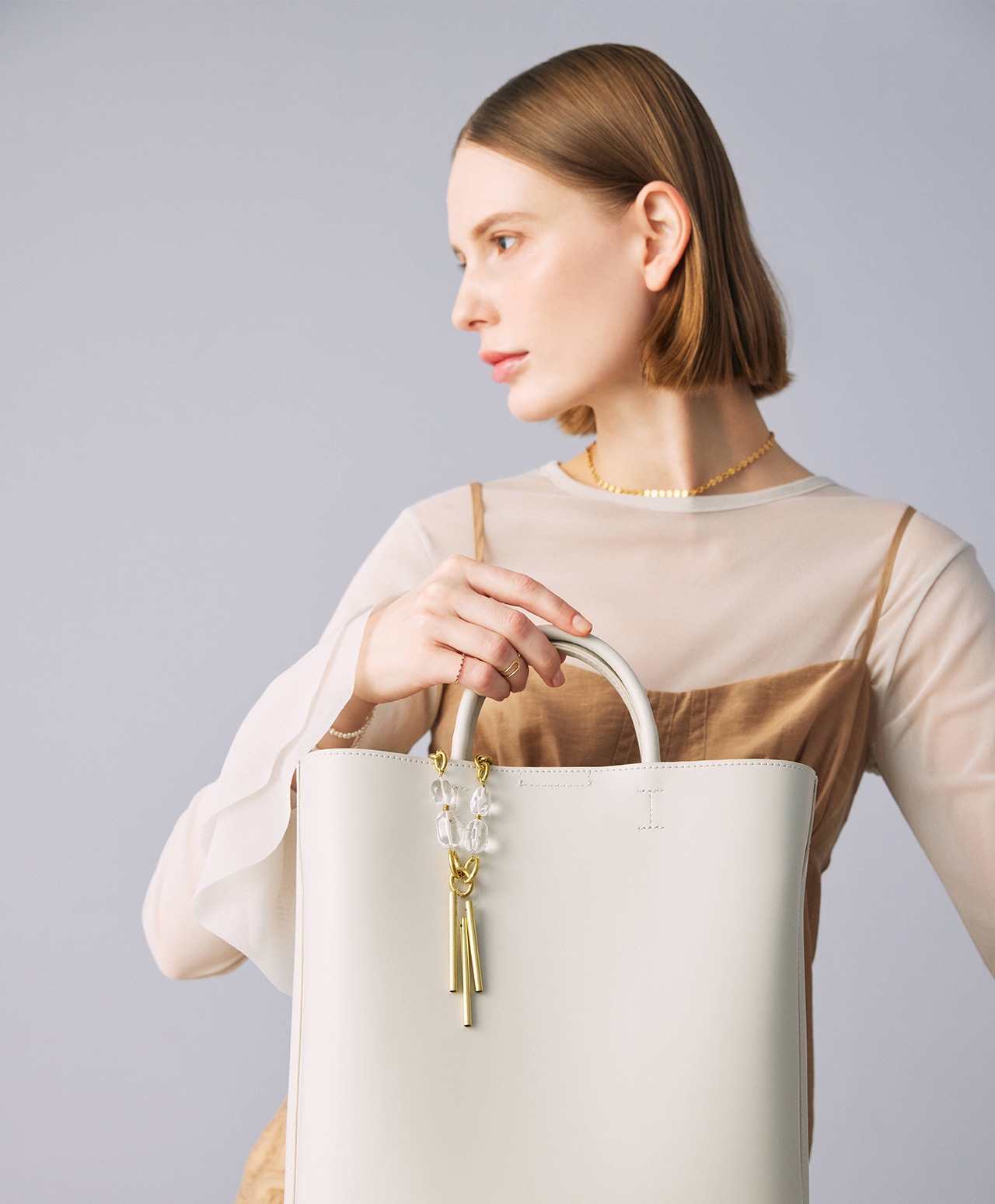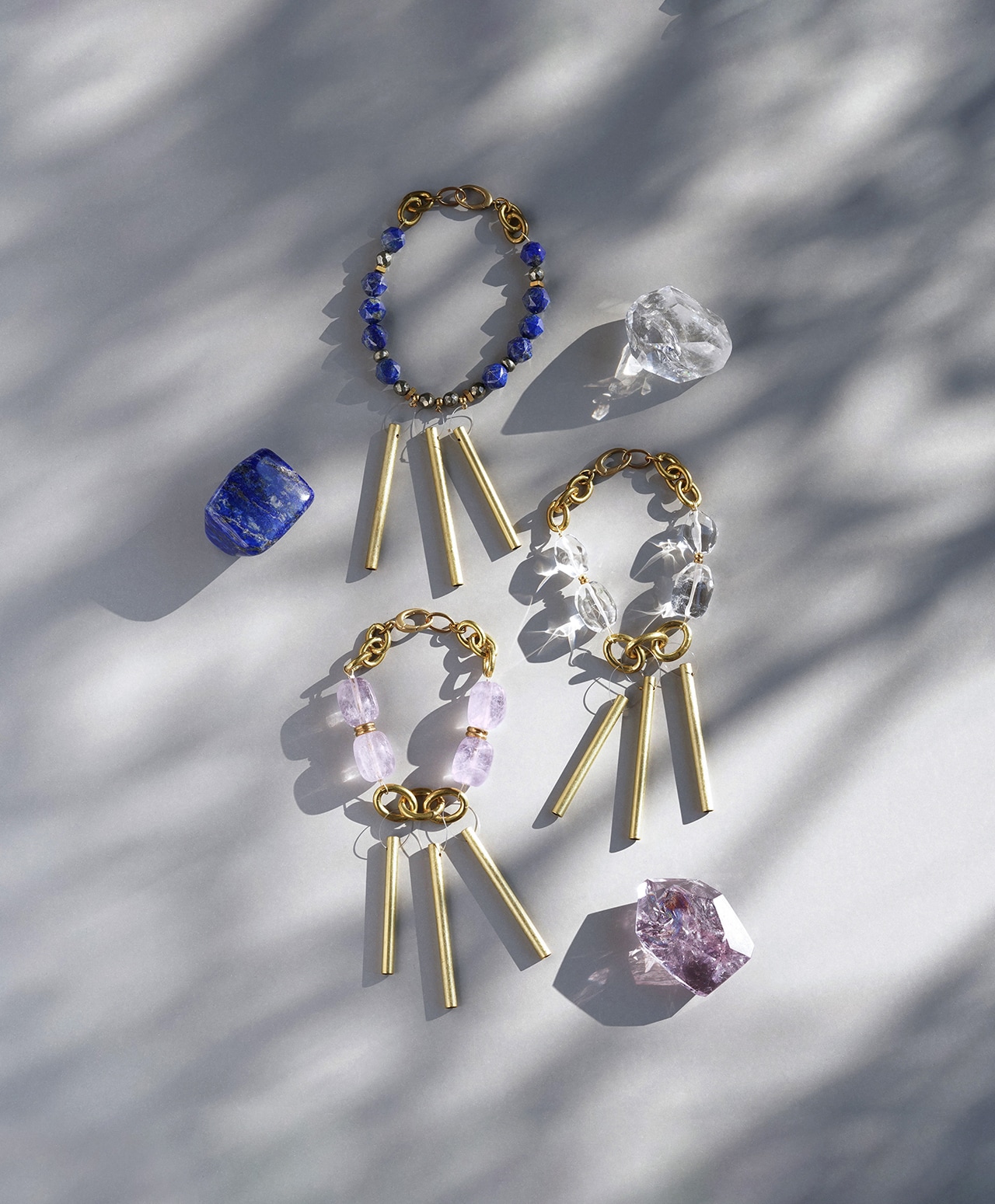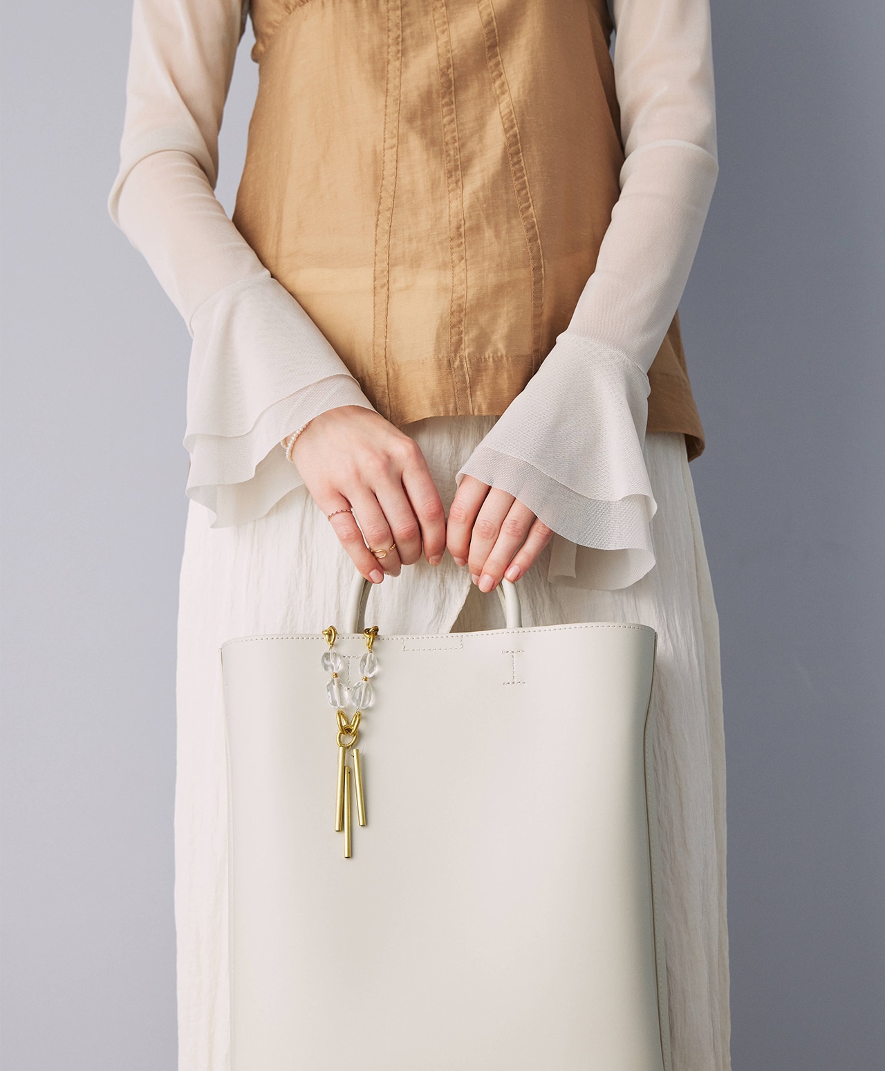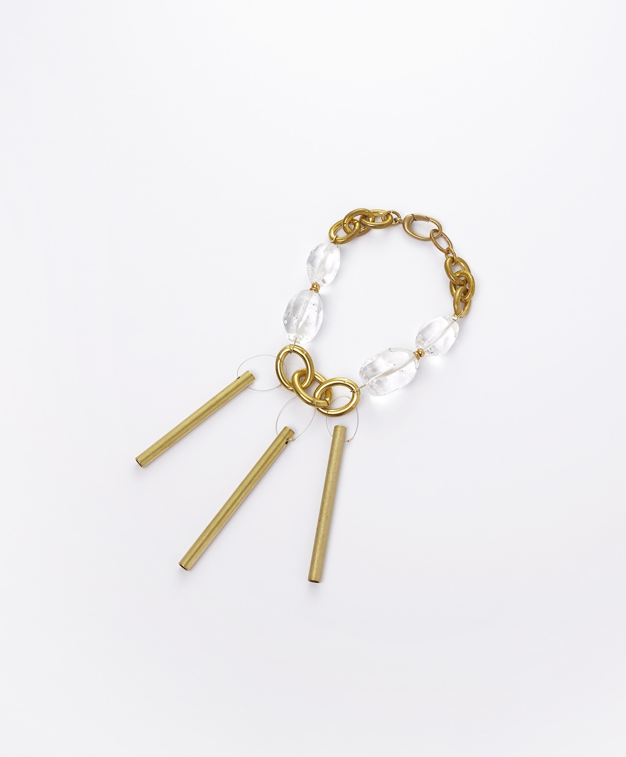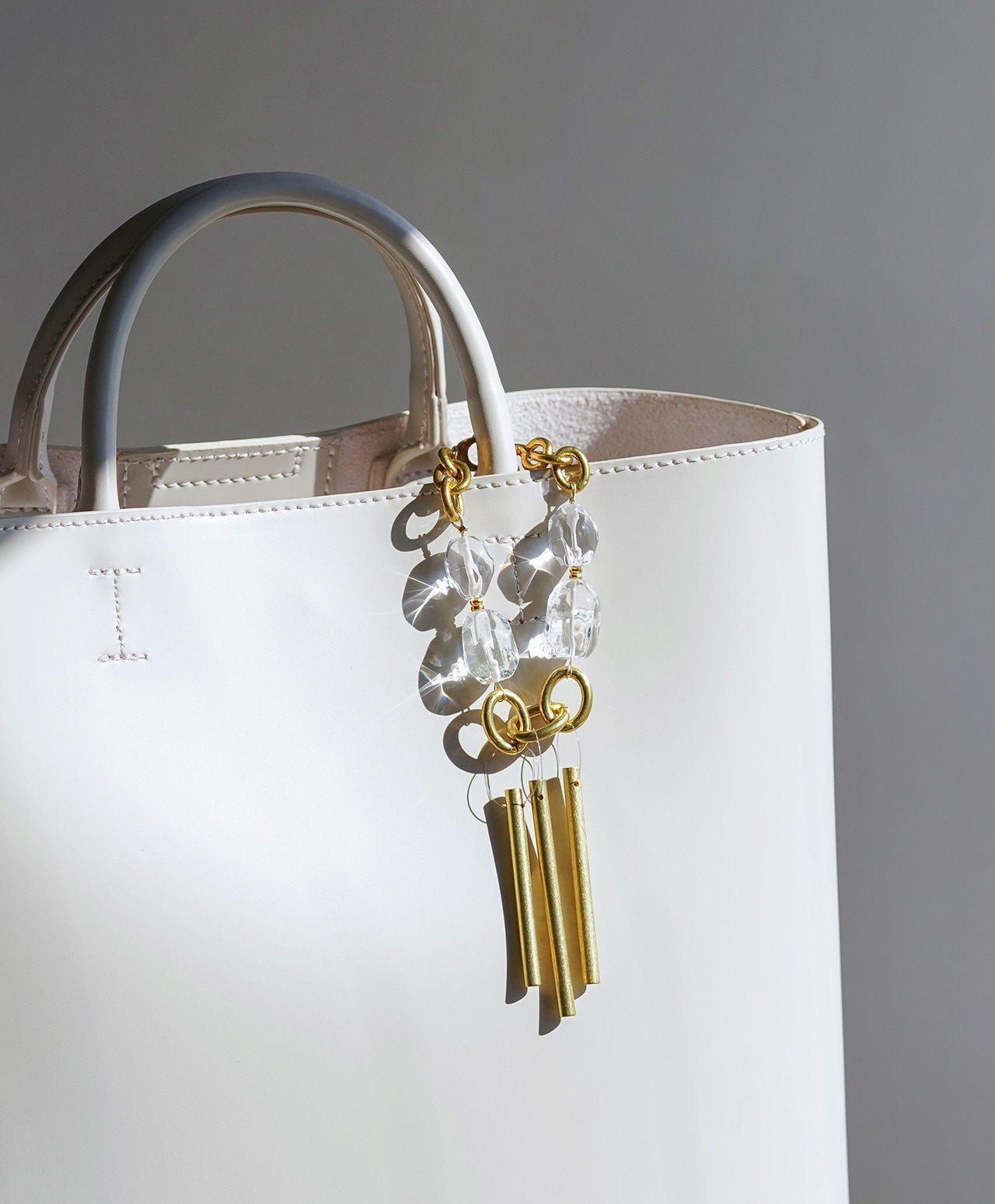 真鍮製のチャイムに、浄化や癒しの力を持つクォーツを組み合わせ、外出先でも浄化ができるバッグチャームとして仕立てました。