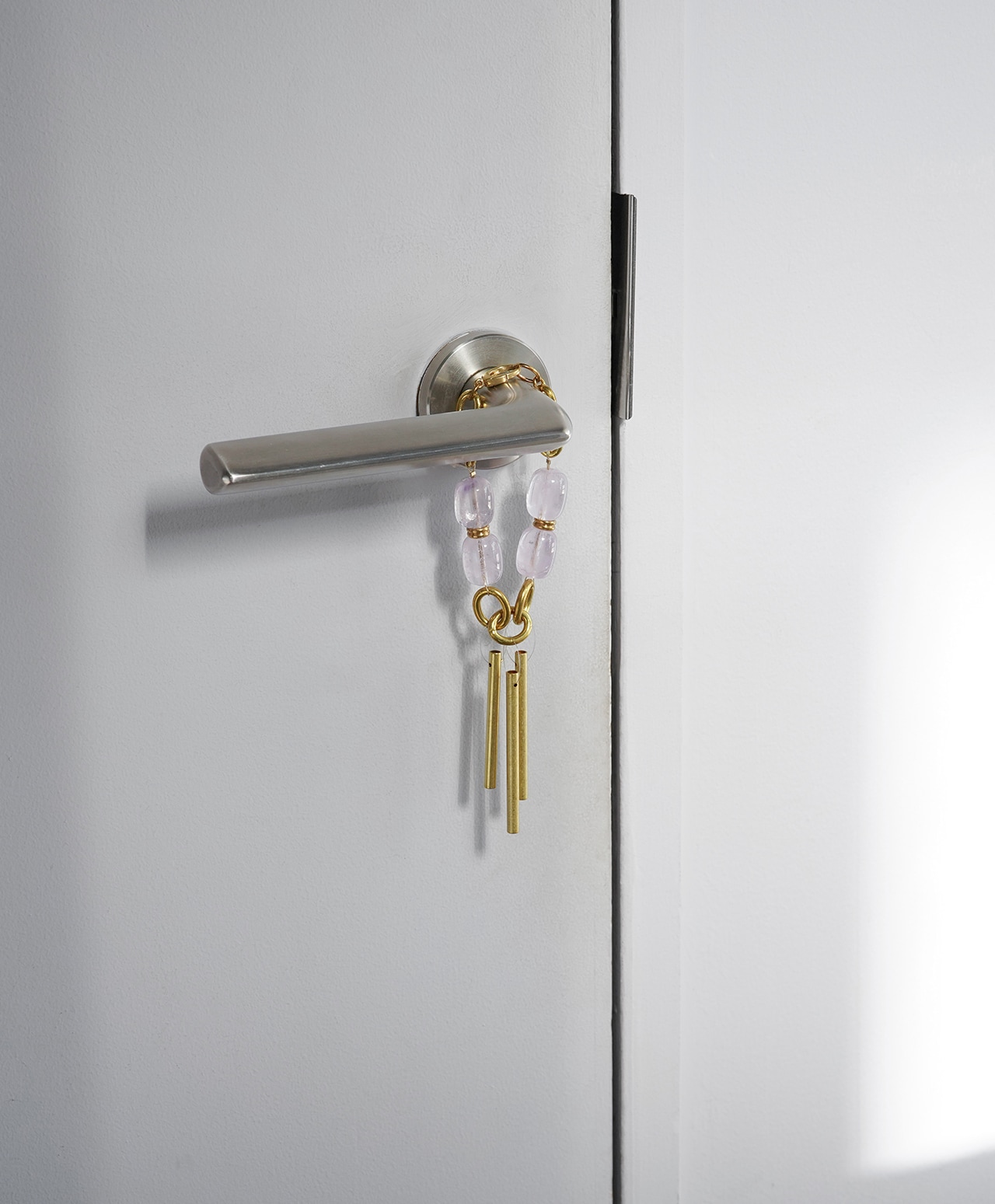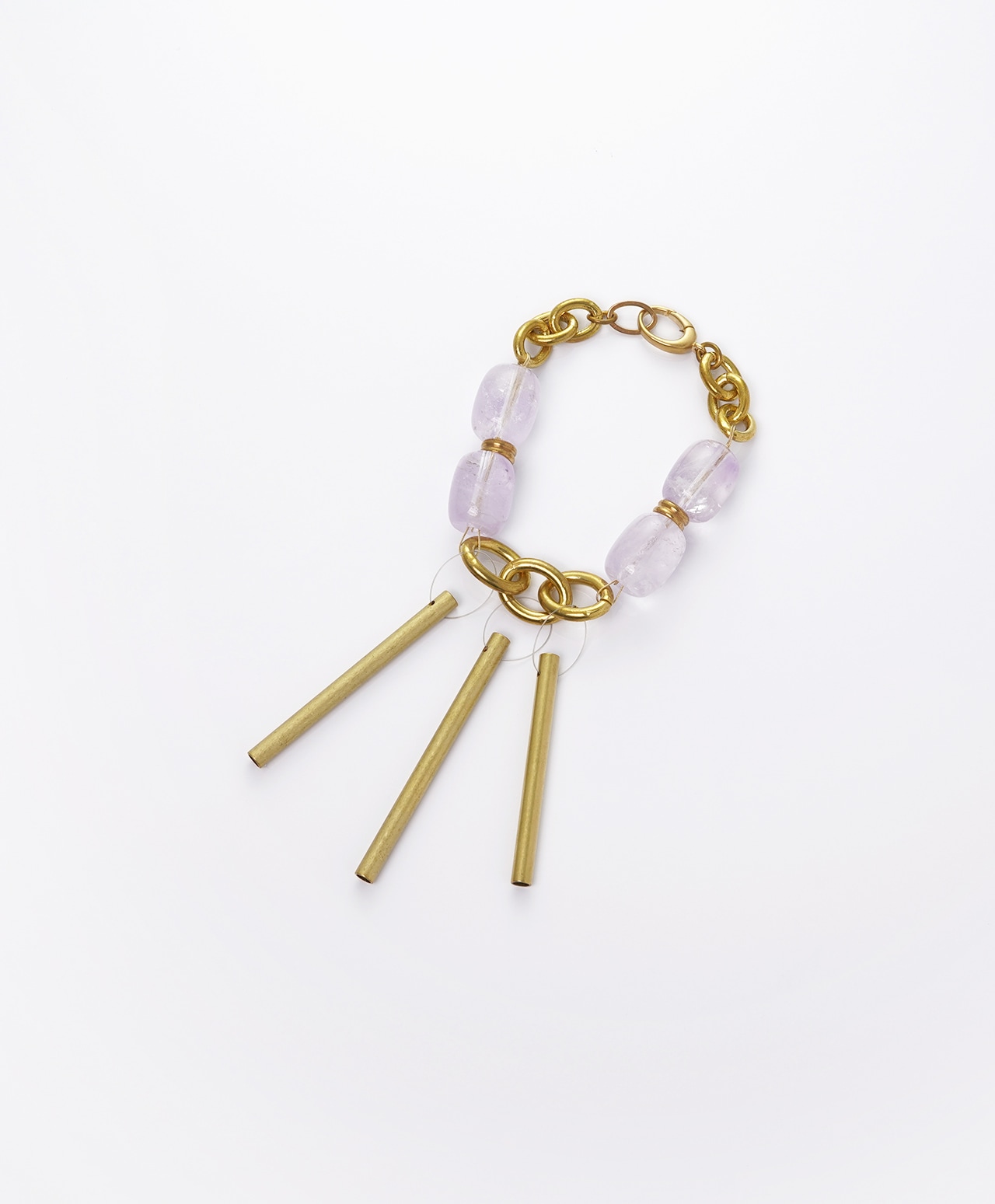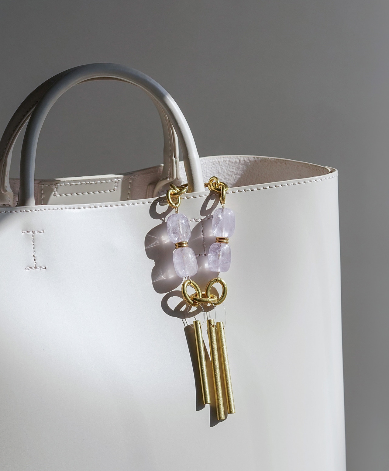 真鍮製のチャイムに、淡く透ける紫が魅力のアメシストを組み合わせ、外出先でも心を整えられるバッグチャームとして仕立てました。