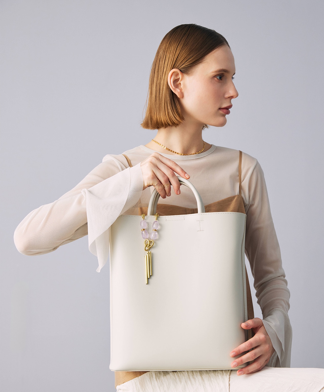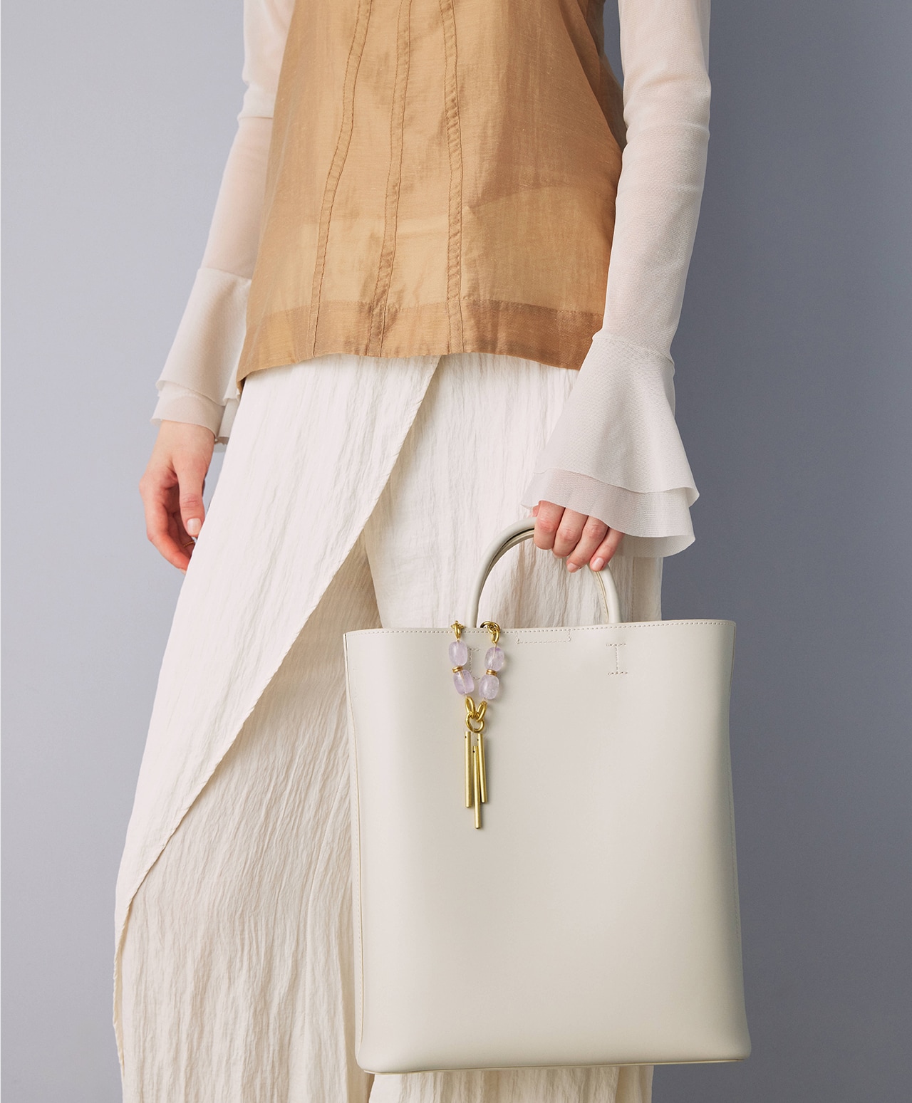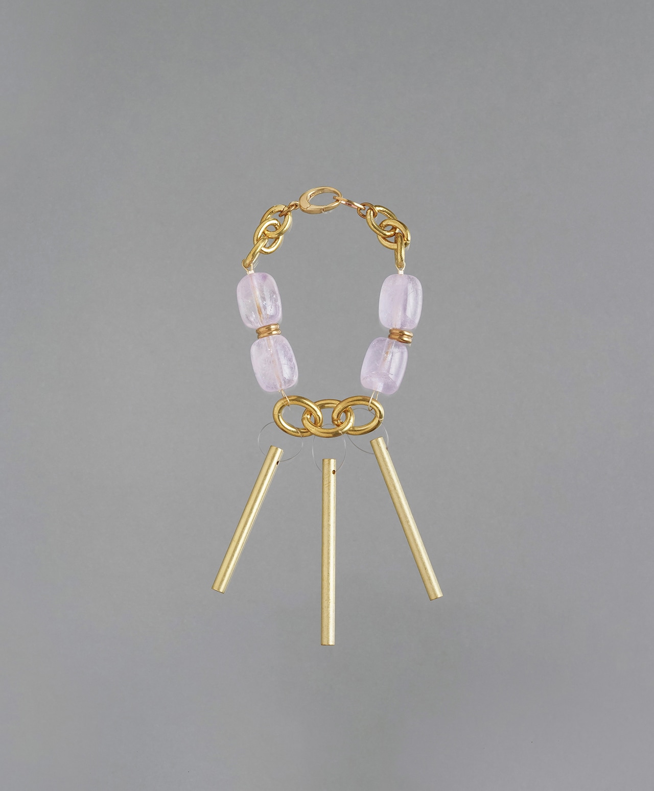 真鍮製のチャイムに、淡く透ける紫が魅力のアメシストを組み合わせ、外出先でも心を整えられるバッグチャームとして仕立てました。