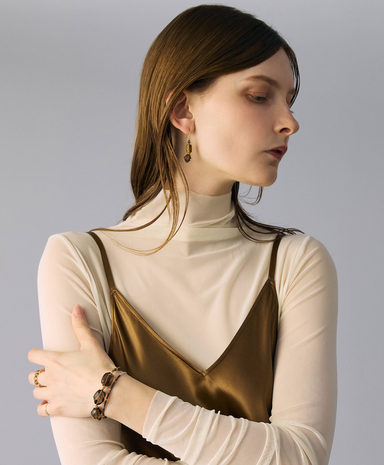 澄んだ透明感をもつ淡いブラウンは、光の入り方によって濃淡を変え、幻想的なニュアンスを描き出します。軽やかな発色でありながら、内側に光を抱え込んだような奥行きのある輝きが、確かな存在感を放ちます。