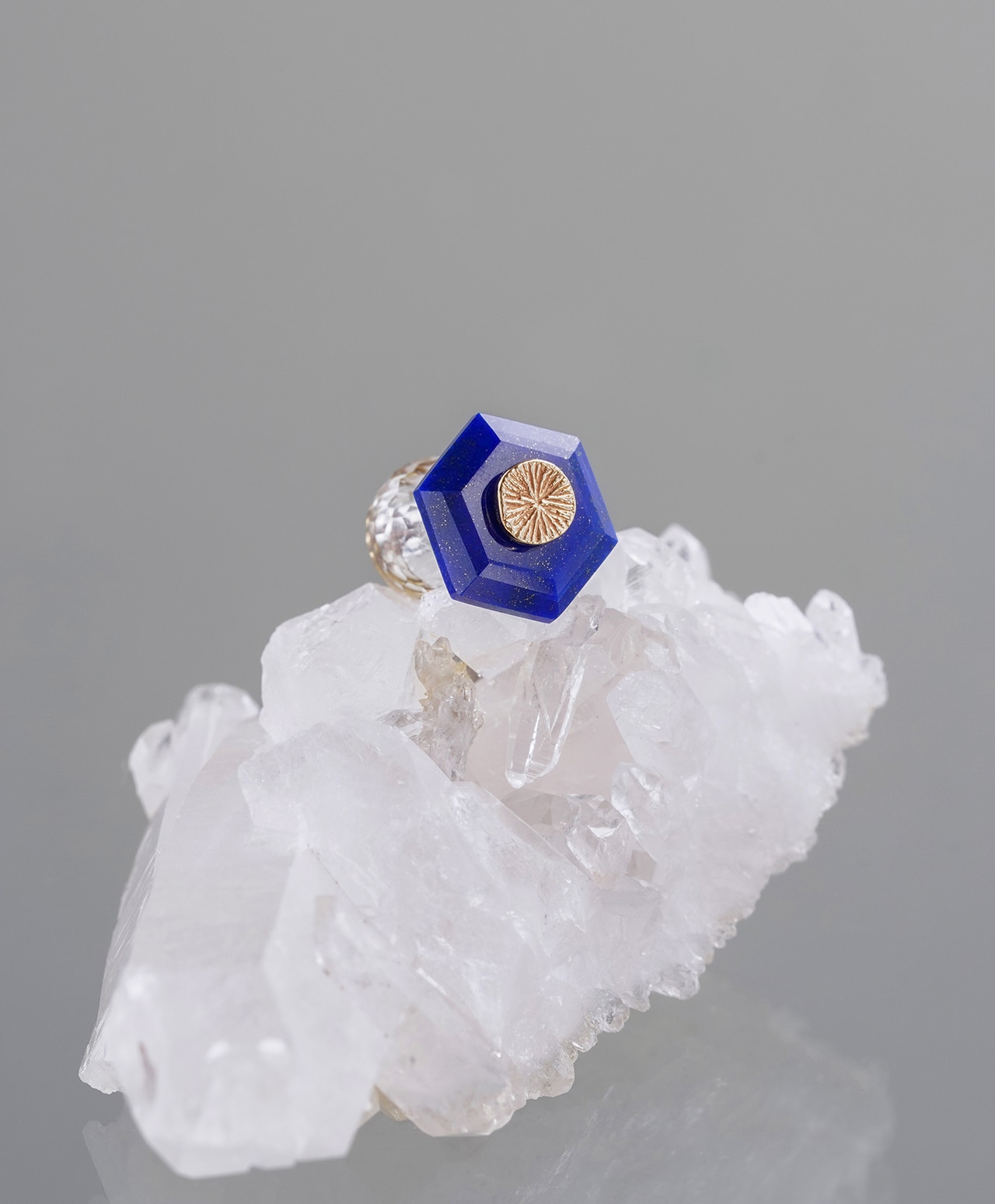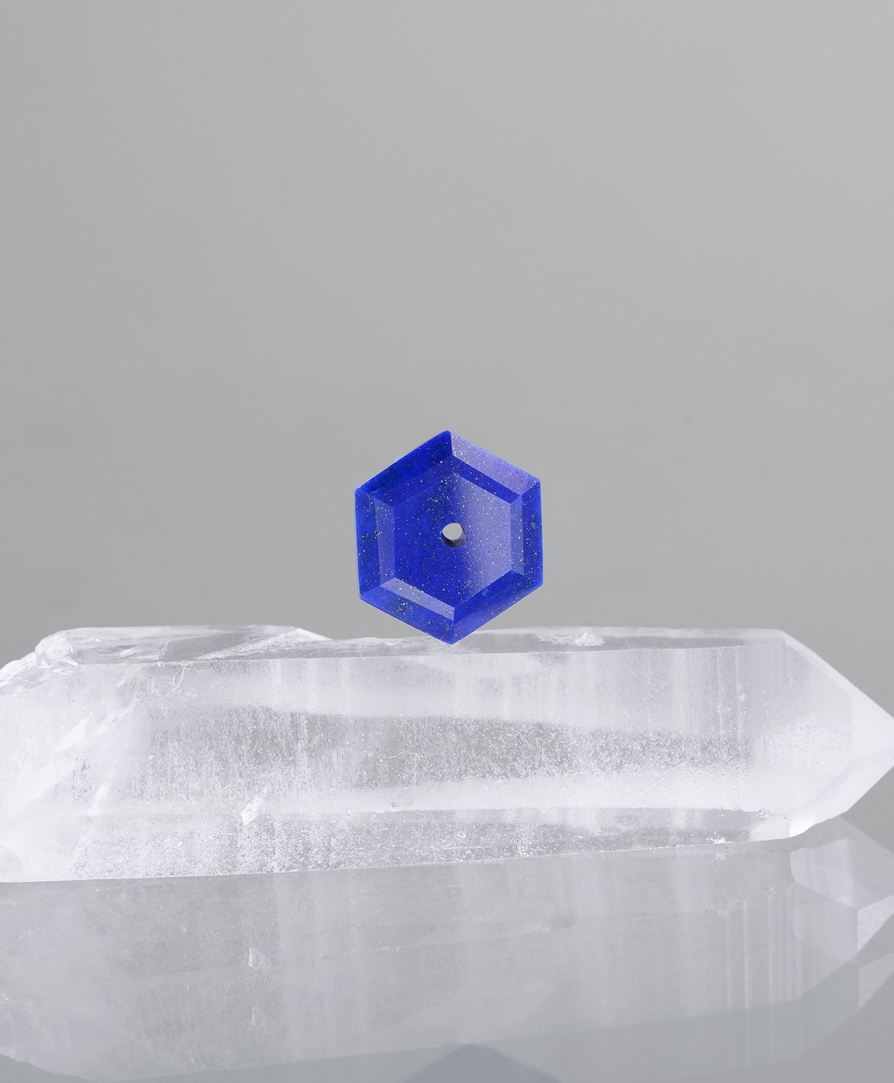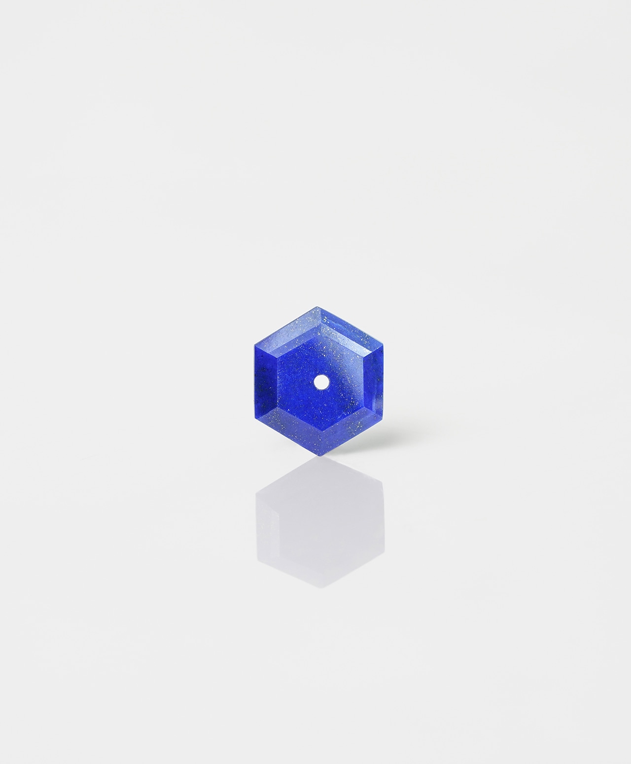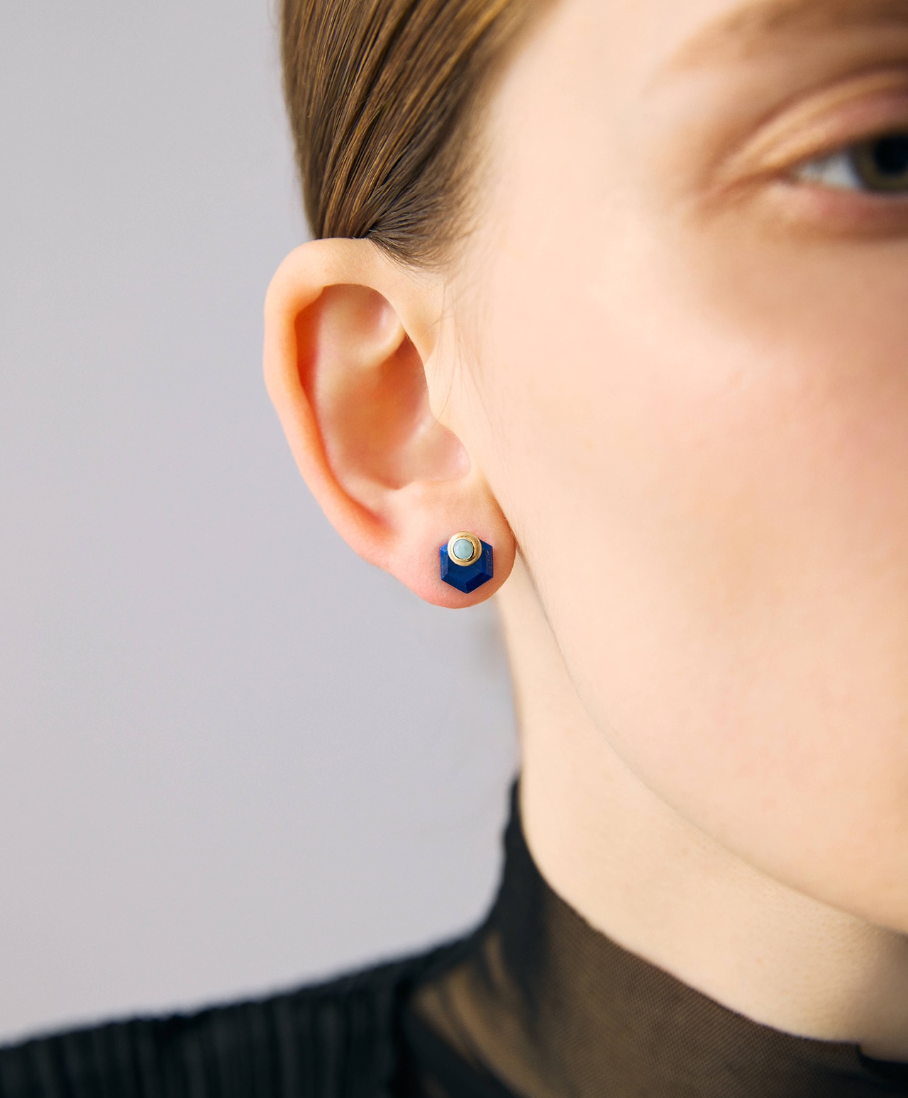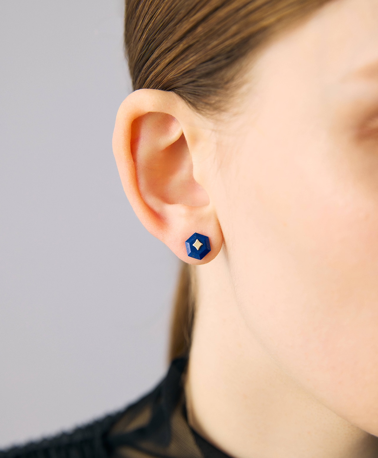 深い群青の輝きを湛えたラピスラズリ(アフガニスタン産)を、端正な六角形のピアスプレートに仕立てました。