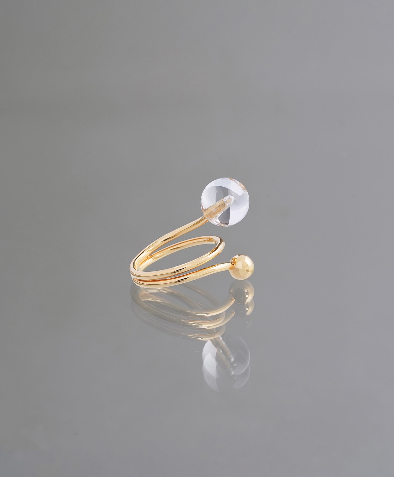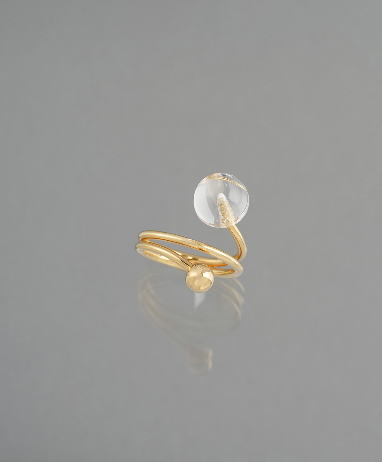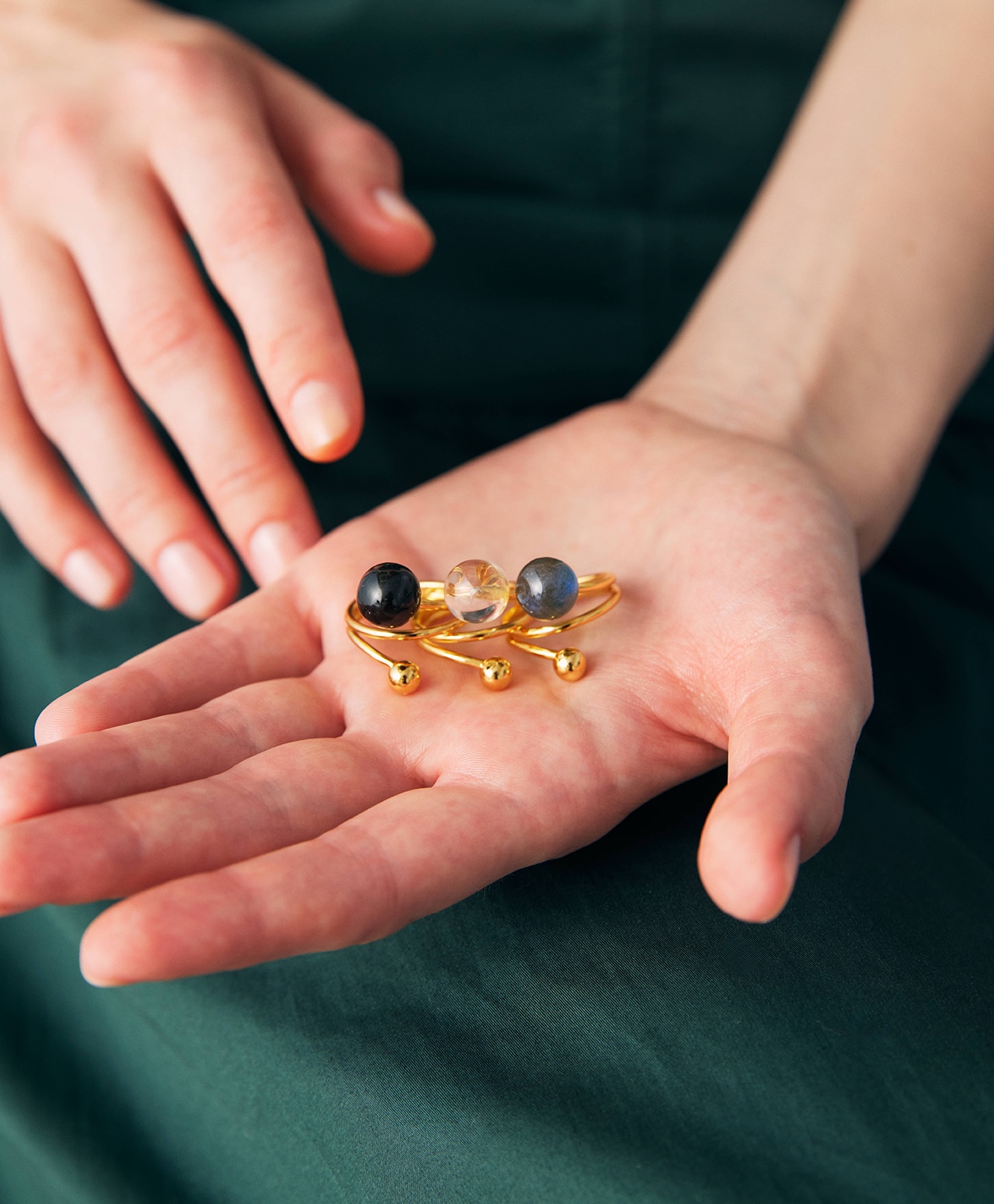 石と地金の丸玉が一直線に並ぶよう配置し、腕のラインは惑星の軌道を思わせる柔らかな円で仕上げています。存在感がありながら、指に吸い付くような着け心地にもこだわりました。