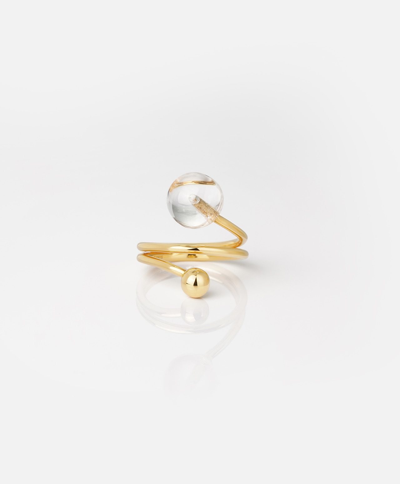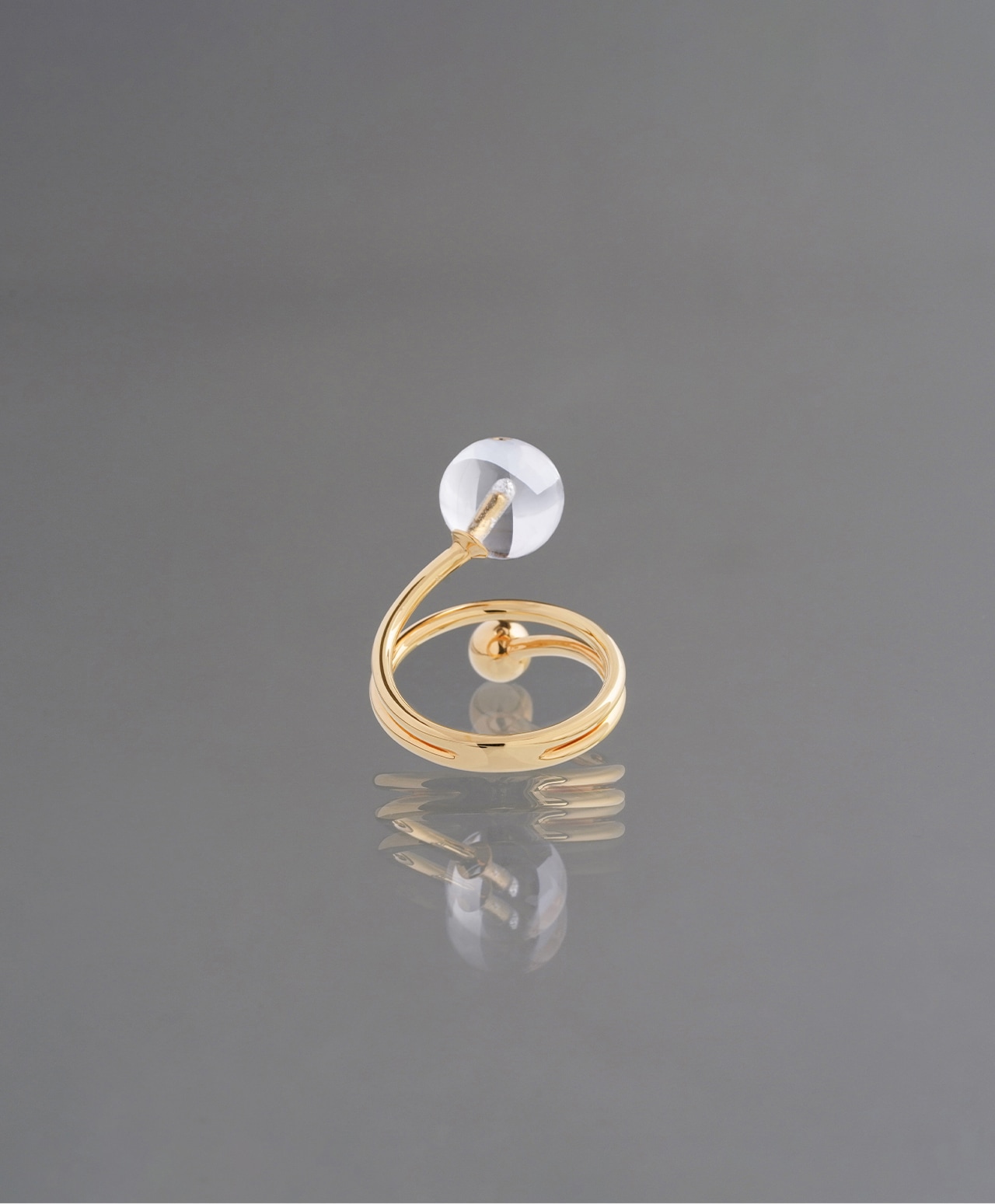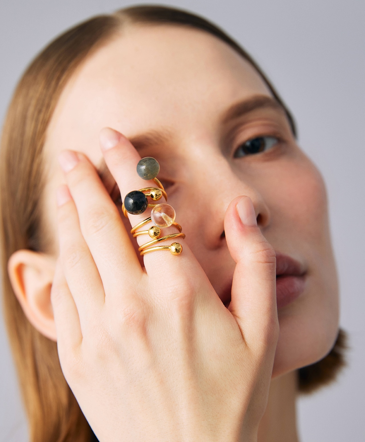 石と地金の丸玉が一直線に並ぶよう配置し、腕のラインは惑星の軌道を思わせる柔らかな円で仕上げています。存在感がありながら、指に吸い付くような着け心地にもこだわりました。