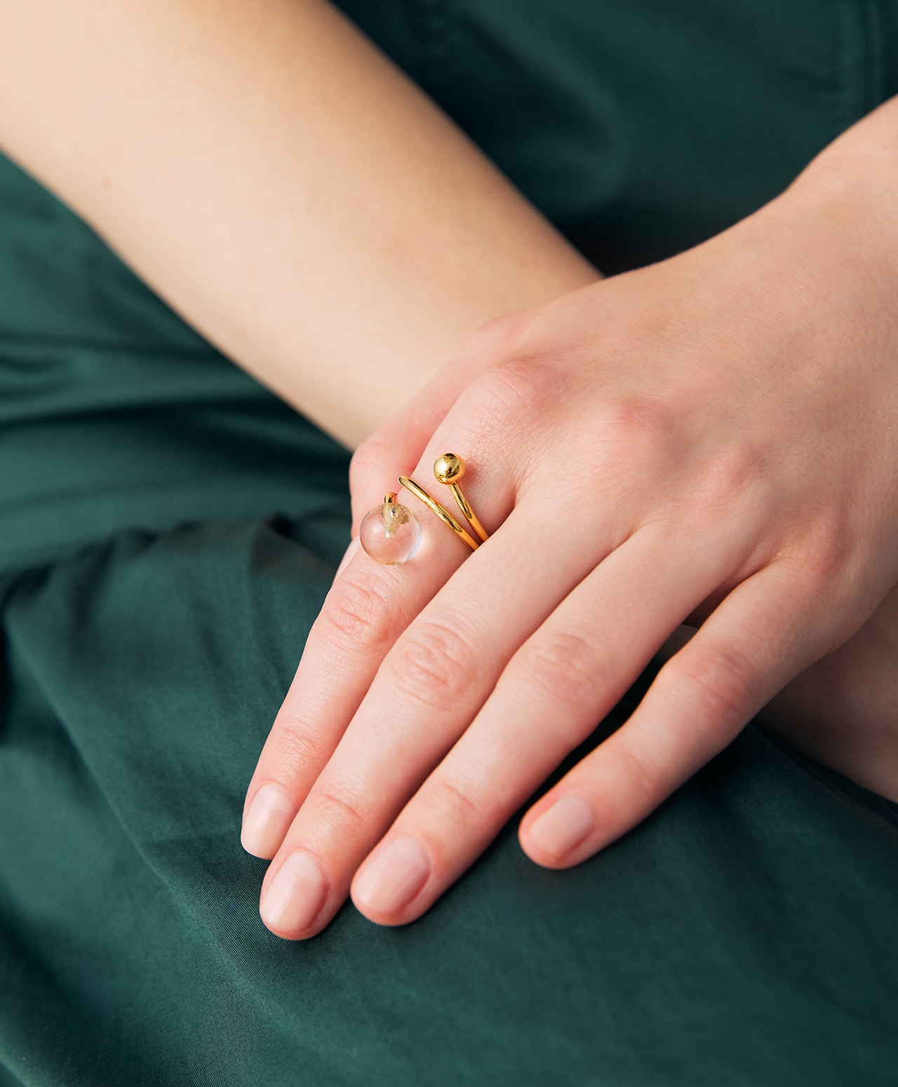 リングに使用したのは、透明度が高く澄み渡る光を湛えたブラジル産レムリアンシードクォーツ。