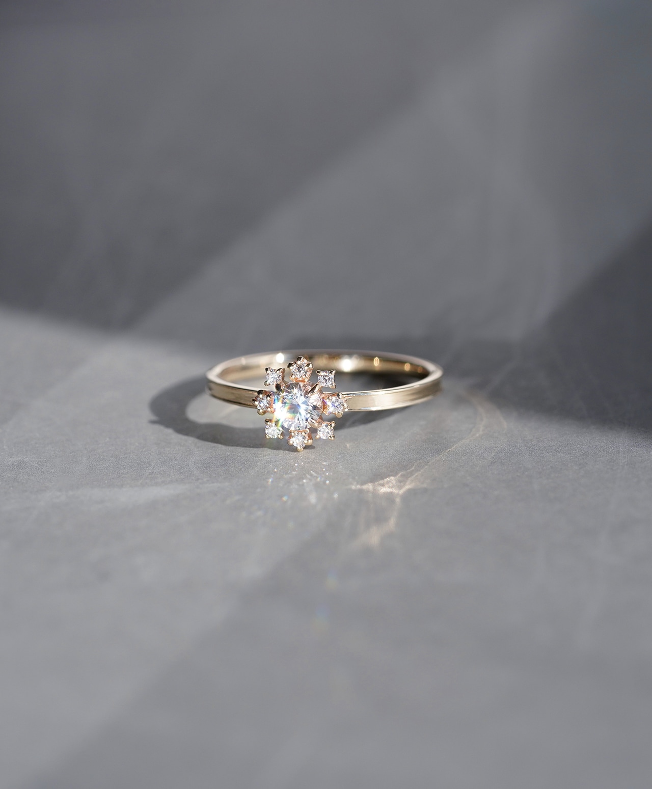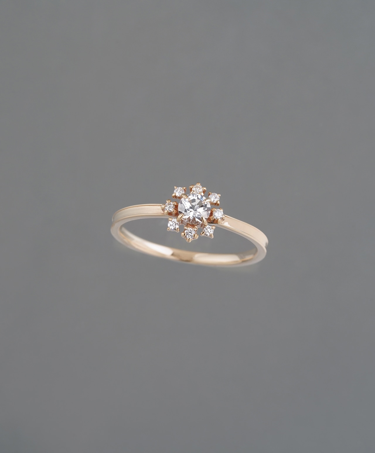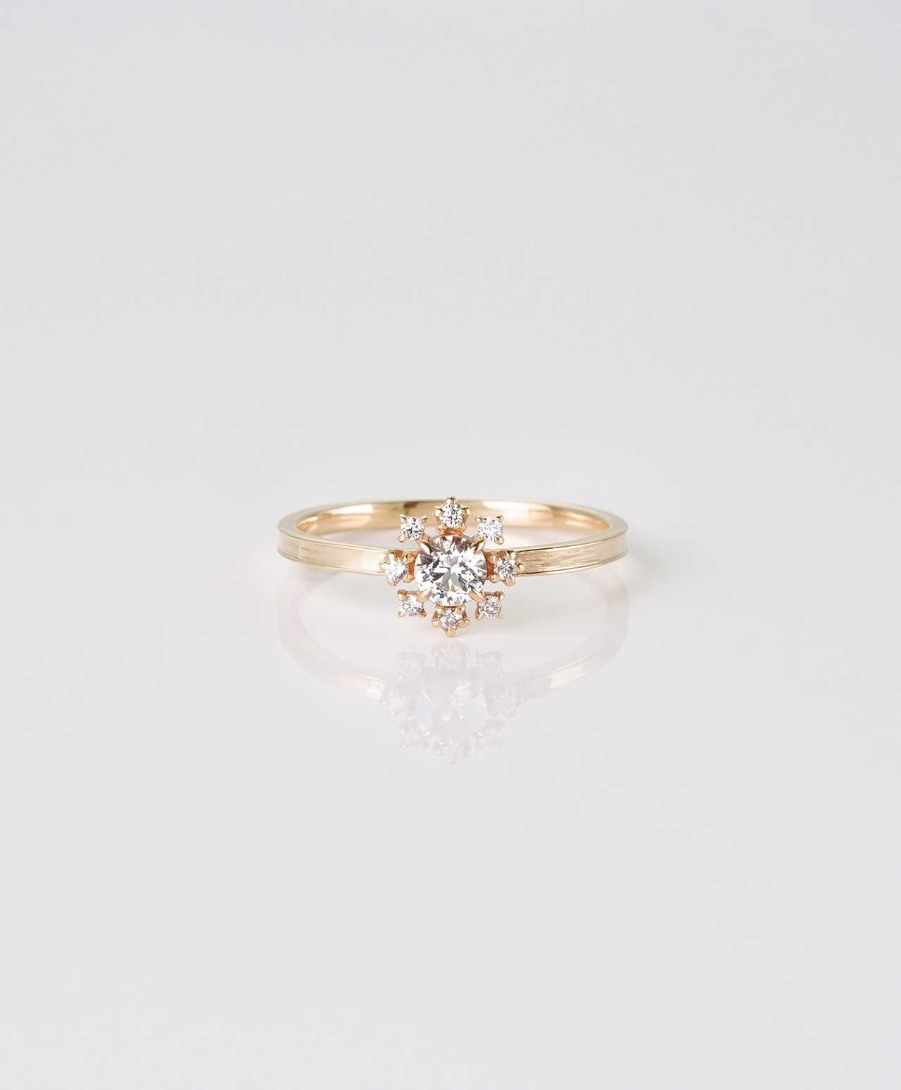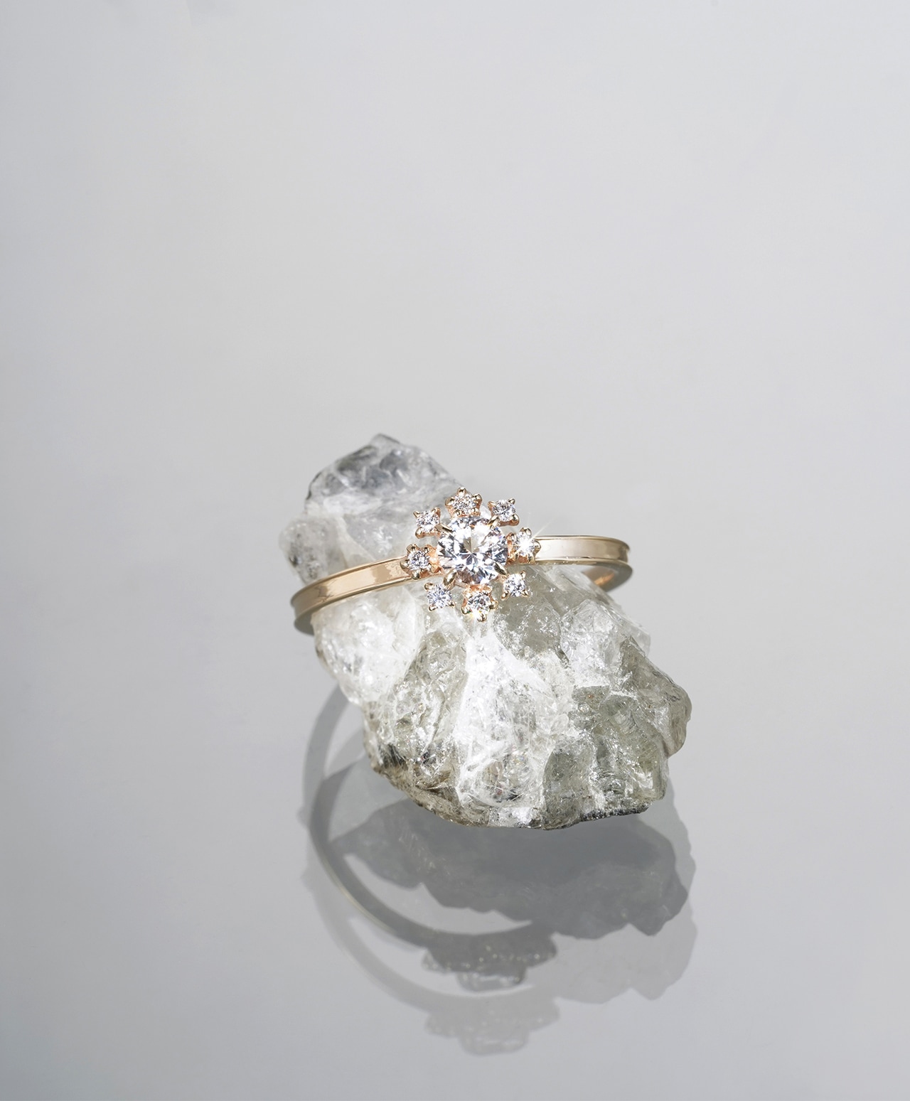 その周囲を取り巻くダイヤモンドは、繊細でありながら確かな煌めきを備え、フェナカイトの光を輪として際立たせます。中心から放たれた白い光が、放射状に、そして後光〈Halo〉となって広がる構造は、象徴的でありながら過度な力を感じさせず、凛とした静けさを保っています。