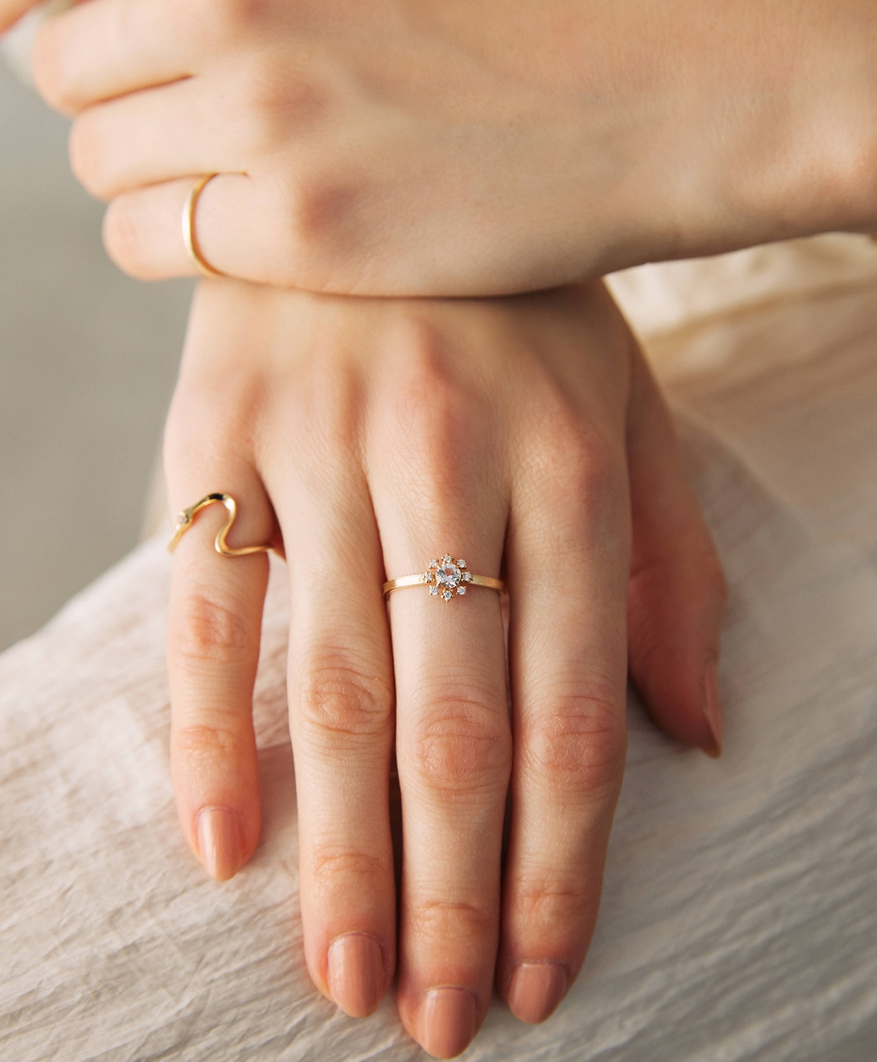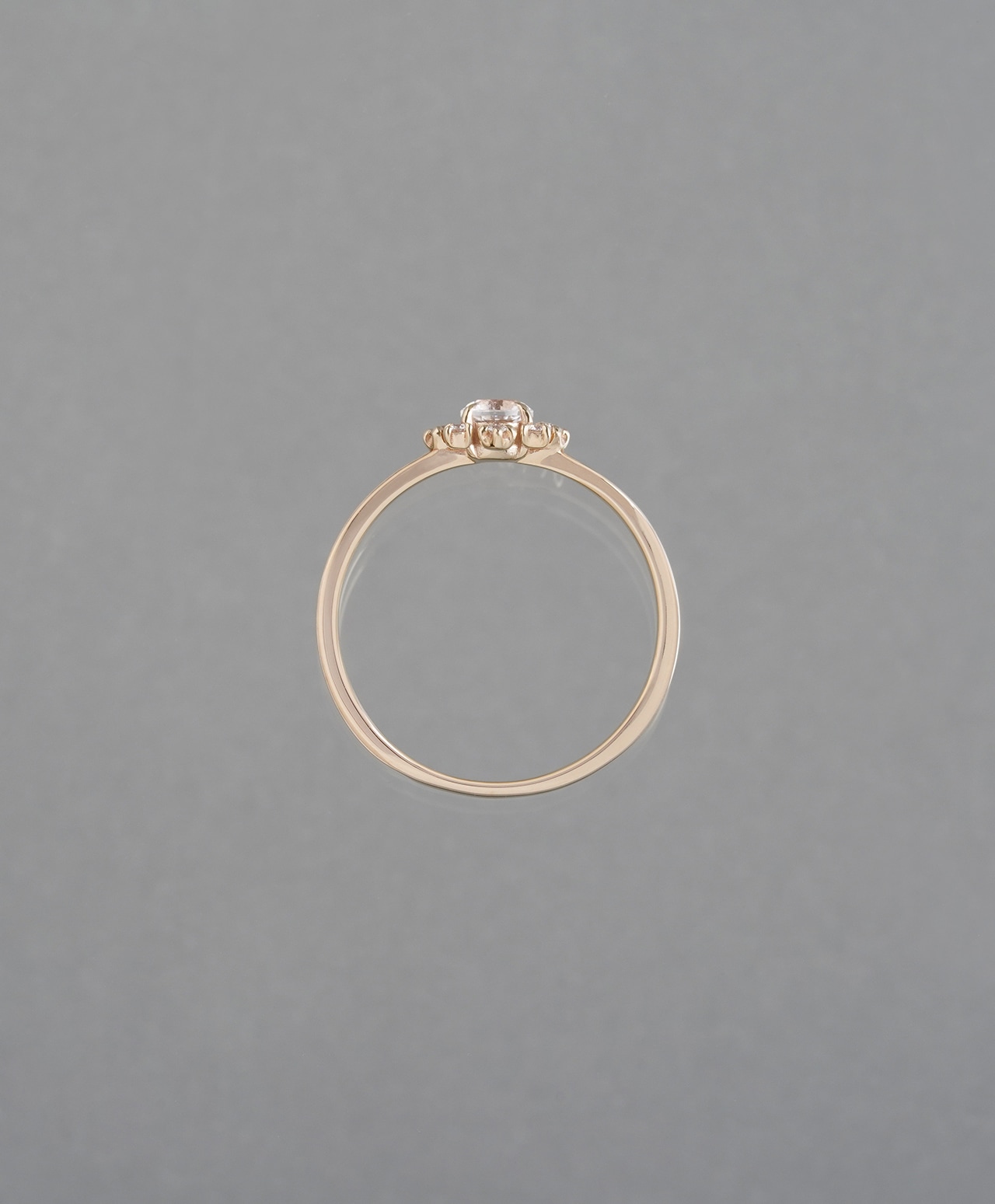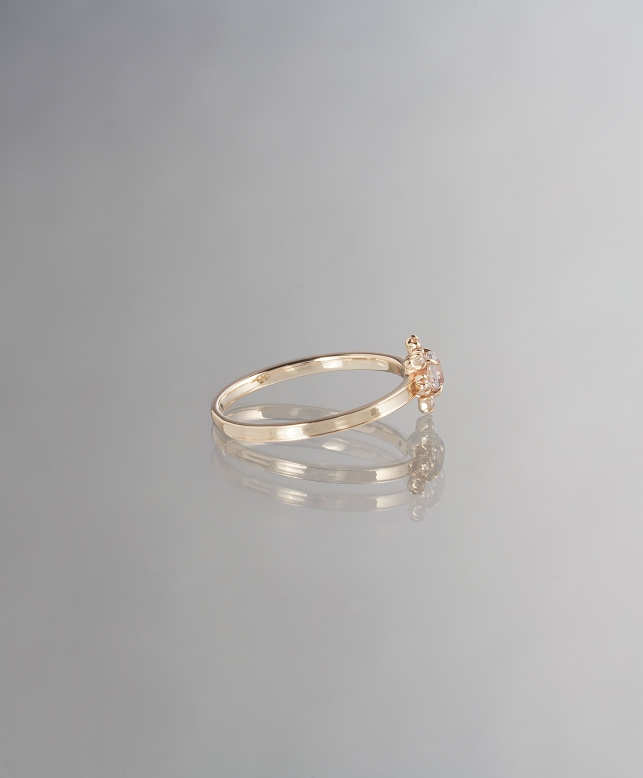 フェナカイトの澄みきった輝きが内側から満ち、その光をダイヤモンドが受け取り、指先へと穏やかに広げていく。