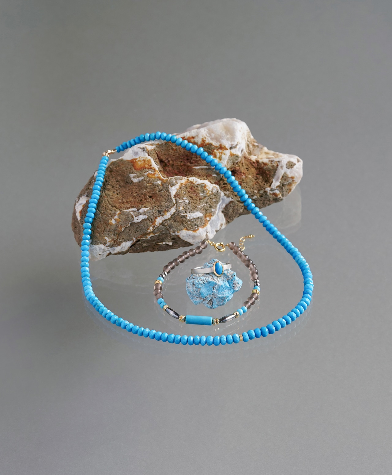 そこから産出されるターコイズは世界でもトップランクの鮮やかなブルーと美しい艶を誇り、まるで抜けるようなアリゾナの青空を閉じ込めたかのよう。眺めているだけで、その先にどこまでも続く空の広がりを感じさせてくれます。