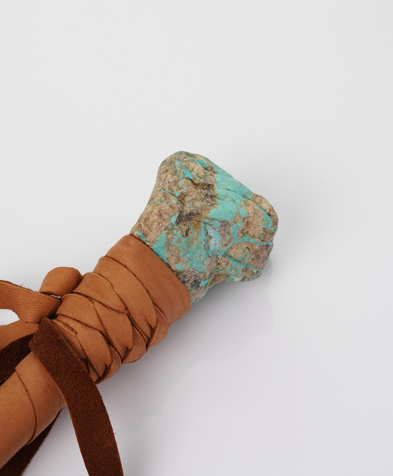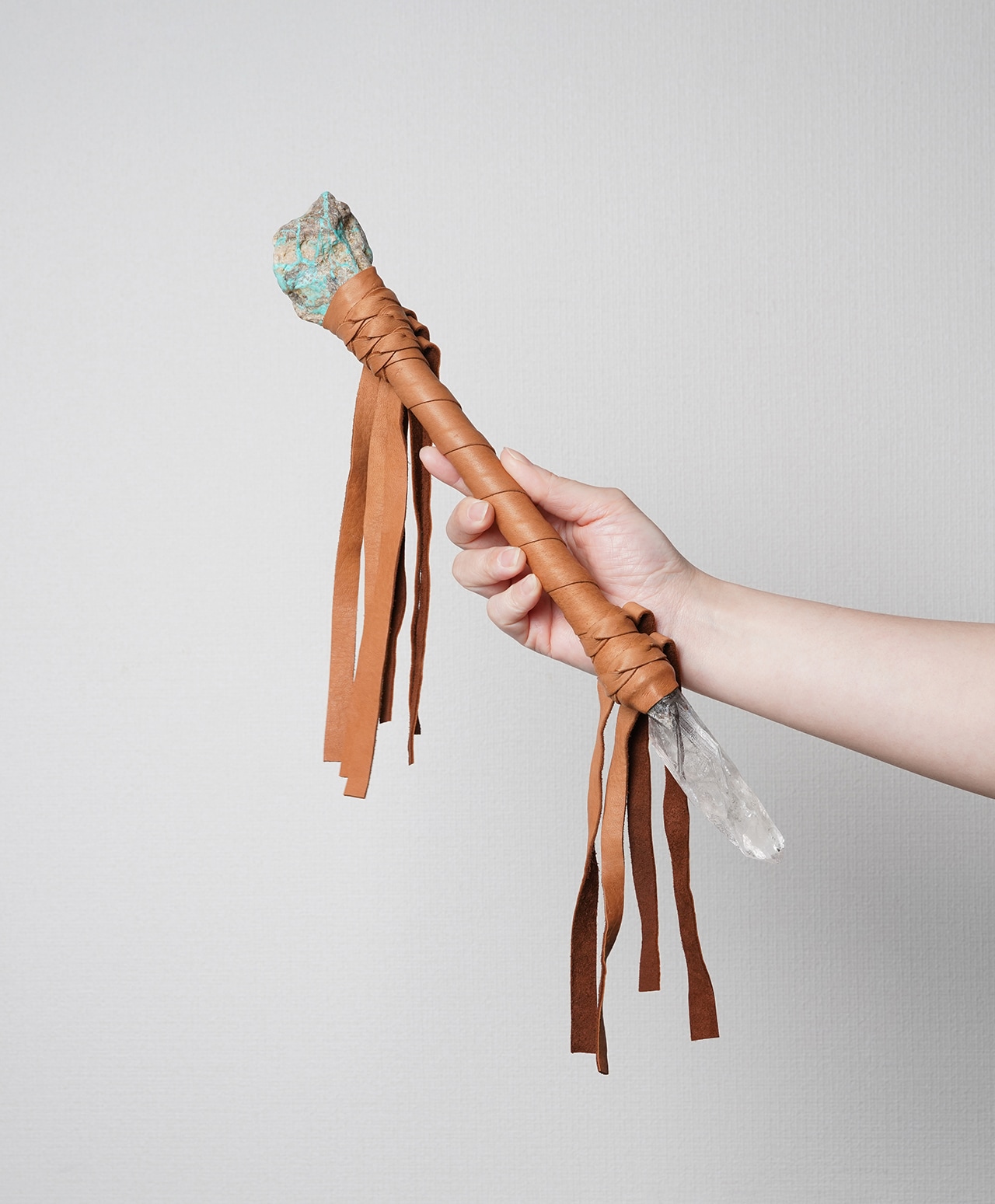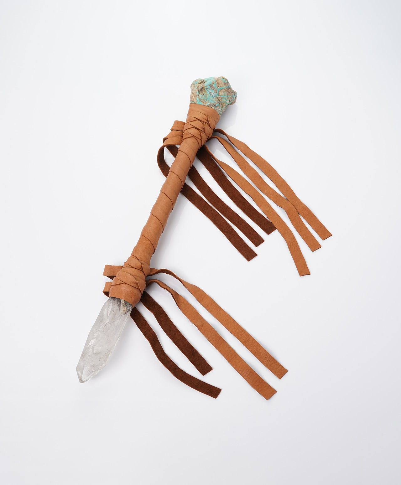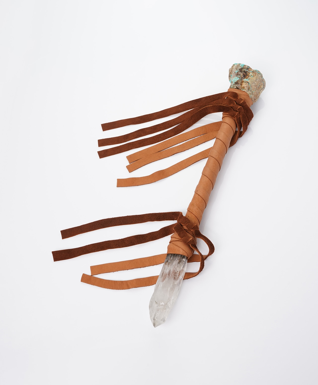 大地を思わせる褐色の鹿革で丁寧に巻かれたハンドル部分から、しなやかな革房が優美に揺れ、ターコイズの青と自然に調和します。持つ人のエネルギーワークを静かにサポートする神聖なツールです。